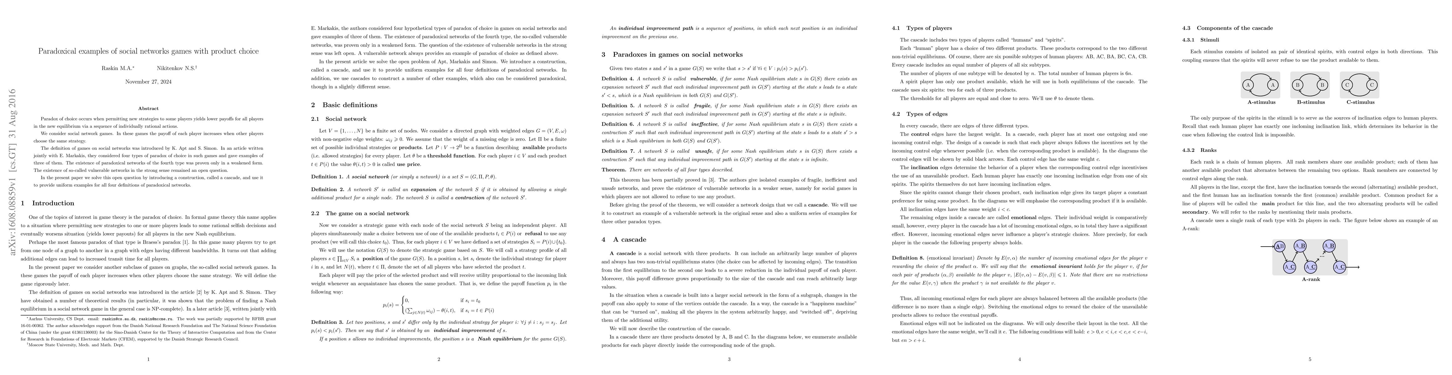This paper resolves the open question regarding the existence of "vulnerable networks" in social network games, demonstrating paradoxical choice scenarios through a new construction termed "cascade." It provides uniform examples for all four types of paradoxical networks previously identified.