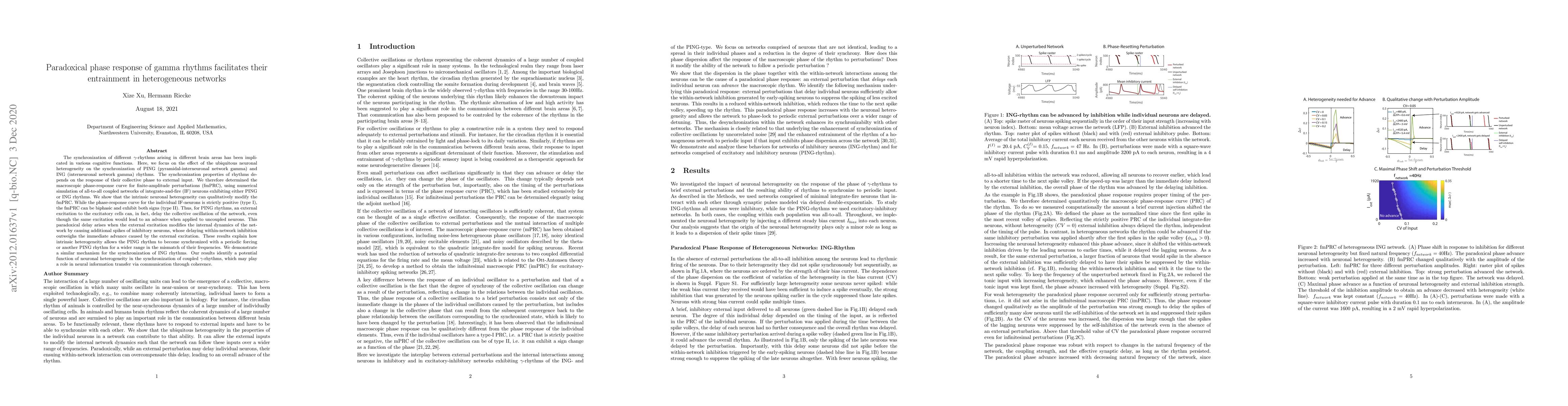 This paper investigates how intrinsic neuronal heterogeneity modifies the synchronization of gamma rhythms in brain networks, revealing that paradoxical phase responses can facilitate entrainment. The study shows that external excitation can delay collective oscillations in PING rhythms due to inhibitory neuron dynamics, broadening the range of frequency mismatches for synchronization.