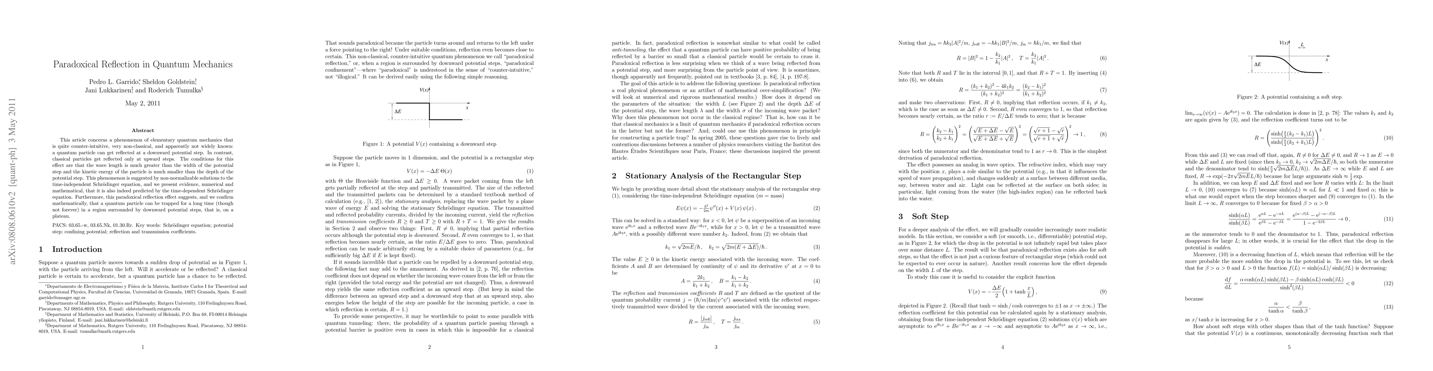 This paper explores the paradoxical quantum reflection phenomenon where a quantum particle can reflect from a downward potential step, contrary to classical expectations. The effect is mathematically supported by non-normalizable solutions to the time-independent Schrödinger equation and is confirmed by the time-dependent Schrödinger equation, suggesting quantum particles can be trapped on plateaus surrounded by downward potential steps.