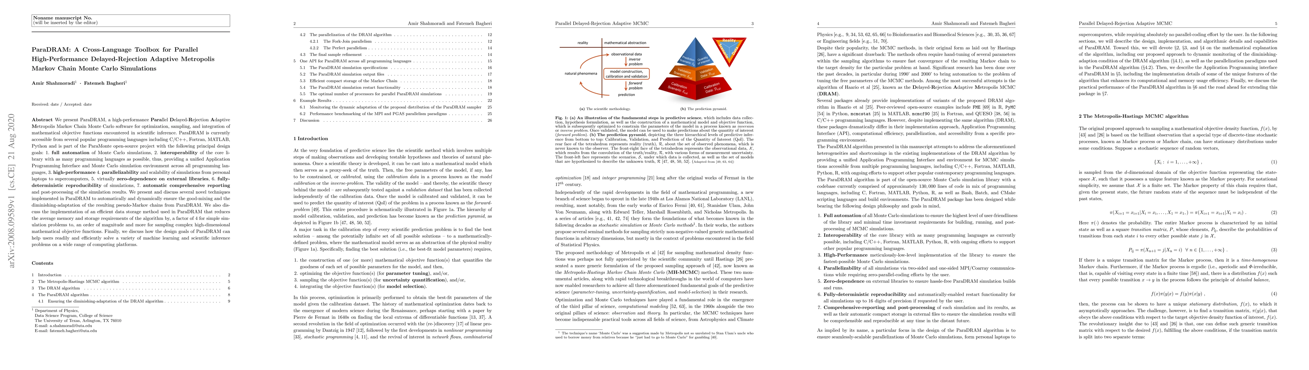 ParaDRAM is a high-performance parallel toolbox for adaptive Metropolis Markov Chain Monte Carlo simulations, supporting multiple programming languages and aiming for full automation, high-performance, and scalability across various computing platforms. It features advanced techniques for efficient memory usage and comprehensive reporting.