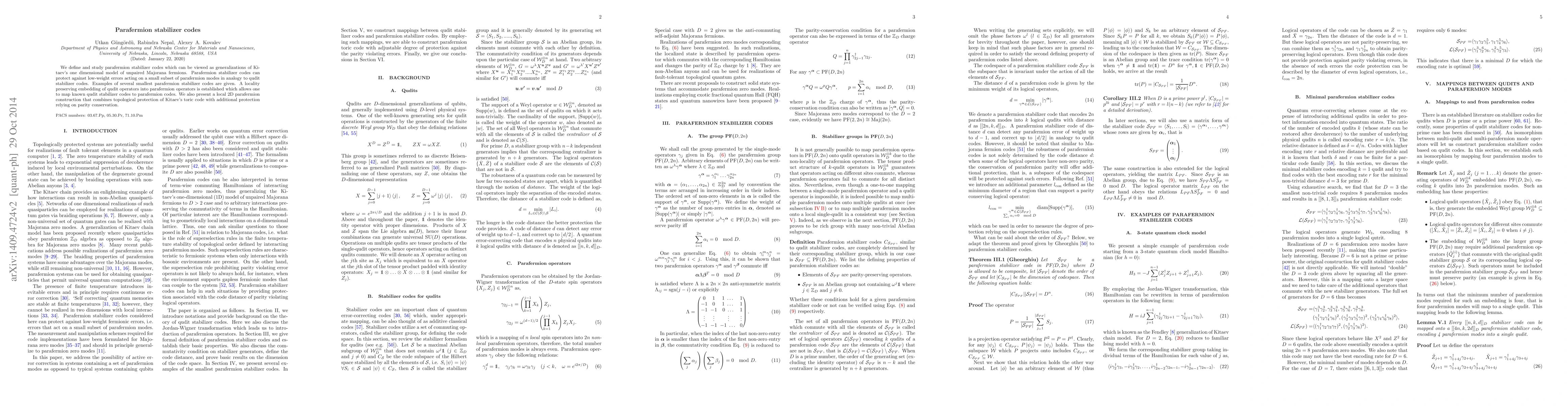 Parafermion stabilizer codes generalize Kitaev's Majorana fermion model and protect against low-weight errors on parafermion modes, analogous to qudit stabilizer codes. A local embedding allows known qudit codes to be mapped to parafermion codes, and a 2D construction combines Kitaev's topological protection with parity-based additional protection.