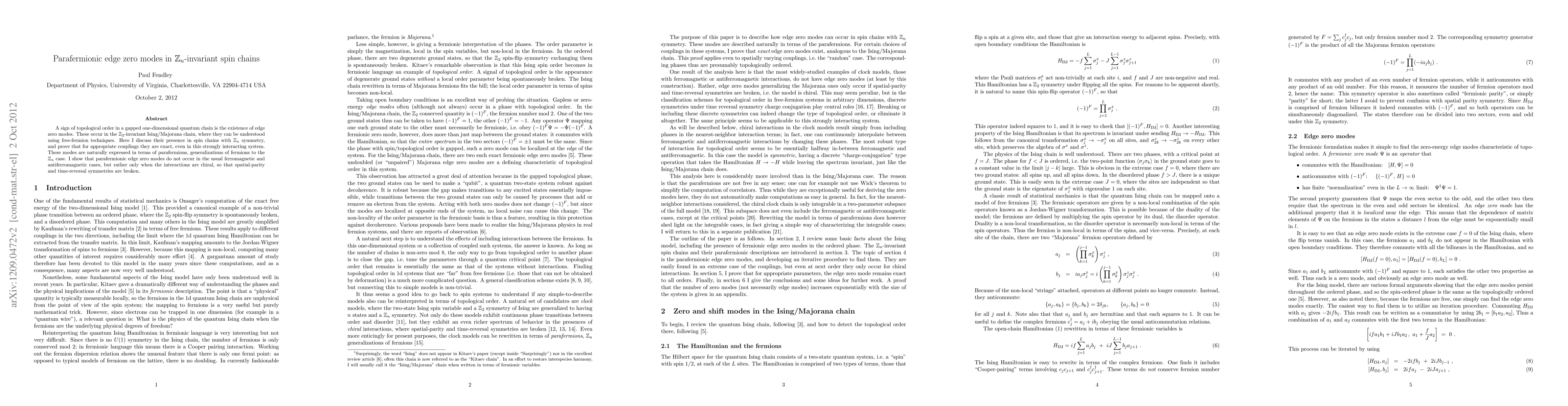 This paper investigates the existence of edge zero modes in Z_n-invariant spin chains, demonstrating that these topologically ordered states can be expressed in terms of parafermions. It proves that such modes are exact in strongly interacting systems with chiral interactions, breaking spatial-parity and time-reversal symmetries.