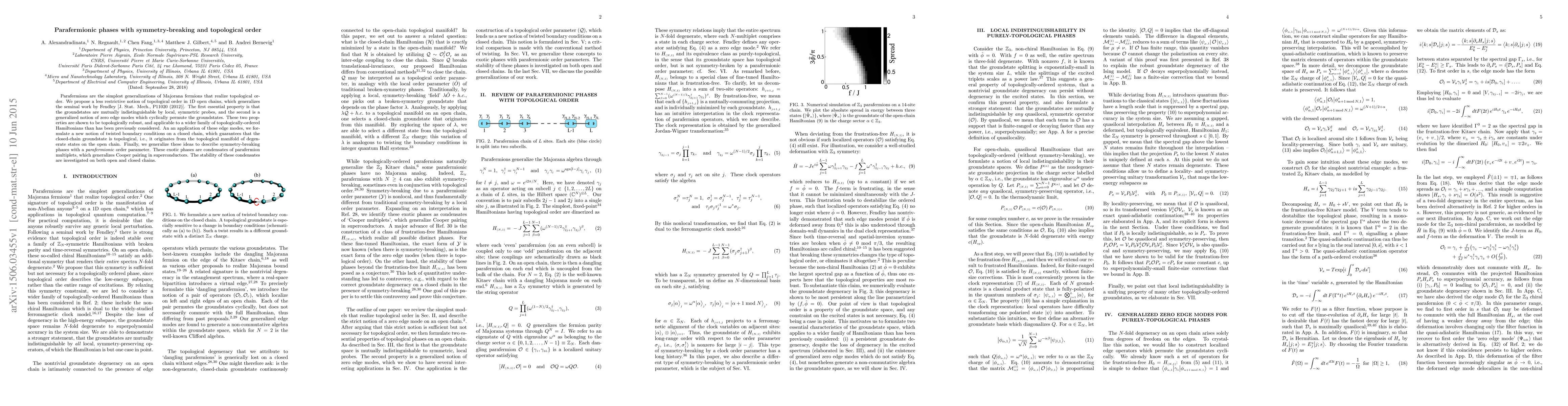 This paper proposes a new notion of topological order in 1D open chains of parafermions, characterized by indistinguishable groundstates and generalized zero edge modes. It also introduces twisted boundary conditions for closed chains to ensure topological groundstates and describes symmetry-breaking phases with parafermionic order parameters, extending Cooper pairing.
