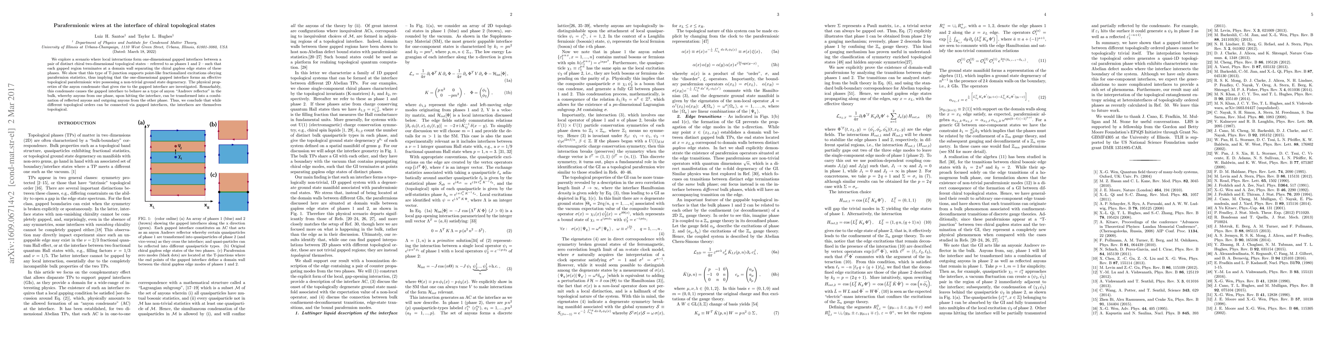 We explore a scenario where local interactions form one-dimensional gapped interfaces between a pair of distinct chiral two-dimensional topological states - referred to as phases 1 and 2 - such that each gapped region terminates at a domain wall separating the chiral gapless edge states of these phases. We show that this type of T-junction supports point-like fractionalized excitations obeying parafermion statistics, thus implying that the one-dimensional gapped interface forms an effective topological parafermionic wire possessing a non-trivial ground state degeneracy. The physical properties of the anyon condensate that gives rise to the gapped interface are investigated. Remarkably, this condensate causes the gapped interface to behave as a type of anyon "Andreev reflector" in the bulk, whereby anyons from one phase, upon hitting the interface, can be transformed into a combination of reflected anyons and outgoing anyons from the other phase. Thus, we conclude that while different topological orders can be connected via gapped interfaces, the interfaces are themselves topological.