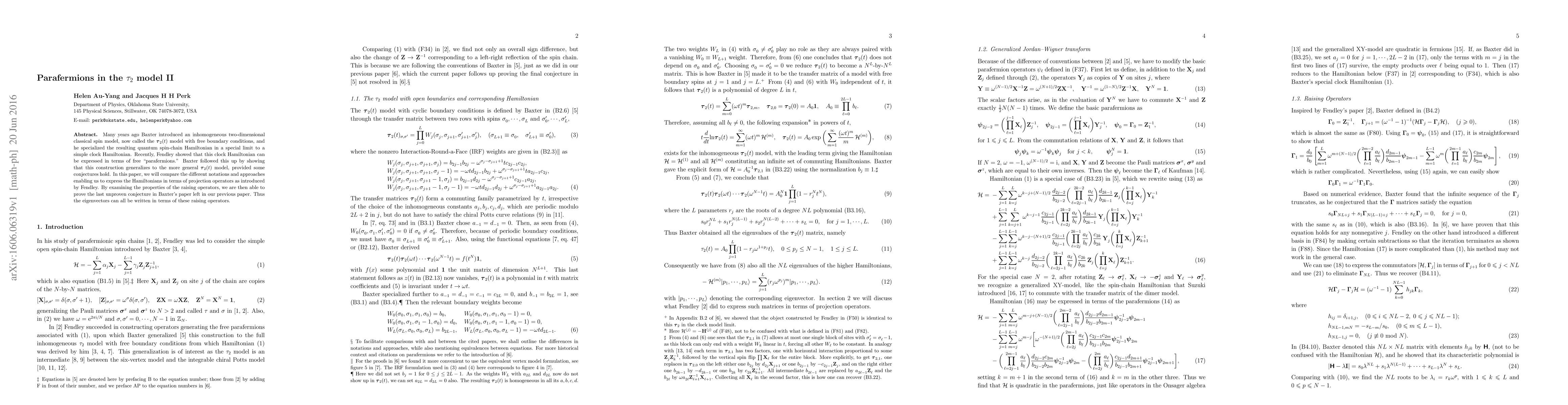 Many years ago Baxter introduced an inhomogeneous two-dimensional classical spin model, now called the $\tau_2(t)$ model with free boundary conditions, and he specialized the resulting quantum spin-chain Hamiltonian in a special limit to a simple clock Hamiltonian. Recently, Fendley showed that this clock Hamiltonian can be expressed in terms of free "parafermions." Baxter followed this up by showing that this construction generalizes to the more general $\tau_2(t)$ model, provided some conjectures hold. In this paper, we will compare the different notations and approaches enabling us to express the Hamiltonians in terms of projection operators as introduced by Fendley. By examining the properties of the raising operators, we are then able to prove the last unproven conjecture in Baxter's paper left in our previous paper. Thus the eigenvectors can all be written in terms of these raising operators.