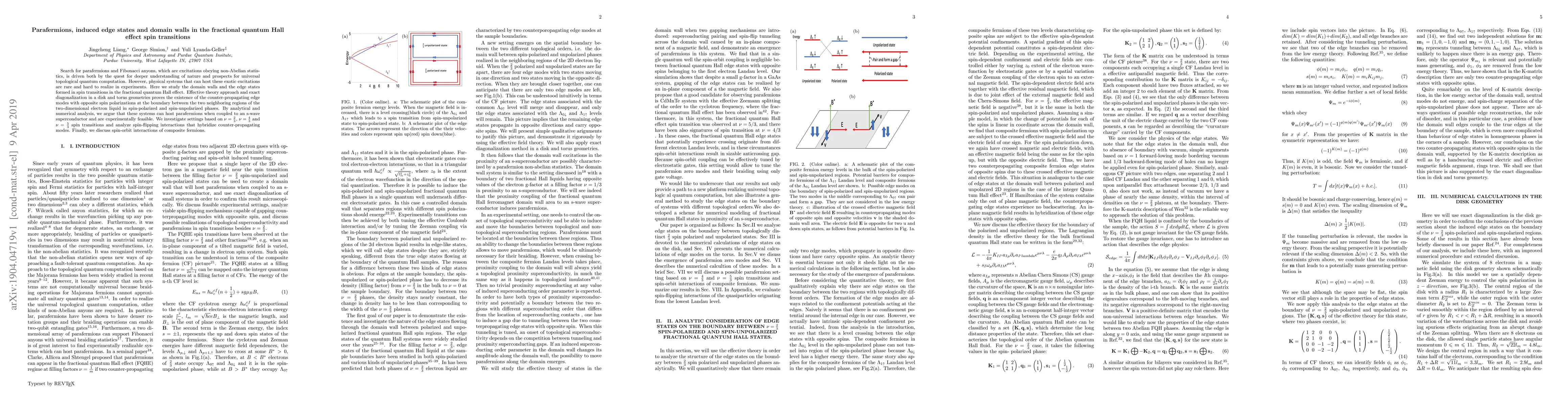 Search for parafermions and Fibonacci anyons, which are excitations obeying non-Abelian statistics, is driven both by the quest for deeper understanding of nature and prospects for universal topological quantum computation. However, physical systems that can host these exotic excitations are rare and hard to realize in experiments. Here we study the domain walls and the edge states formed in spin transitions in the fractional quantum Hall effect. Effective theory approach and exact diagonalization in a disk and torus geometries proves the existence of the counter-propagating edge modes with opposite spin polarizations at the boundary between the two neighboring regions of the two-dimensional electron liquid in spin-polarized and spin-unpolarized phases. By analytical and numerical analysis, we argue that these systems can host parafermions when coupled to an s-wave superconductor and are experimentally feasible. We investigate settings based on $\nu=\frac{2}{3}$, $\nu=\frac{4}{3}$ and $\nu=\frac{5}{3}$ spin transitions and analyze spin-flipping interactions that hybridize counter-propagating modes. Finally, we discuss spin-orbit interactions of composite fermions.