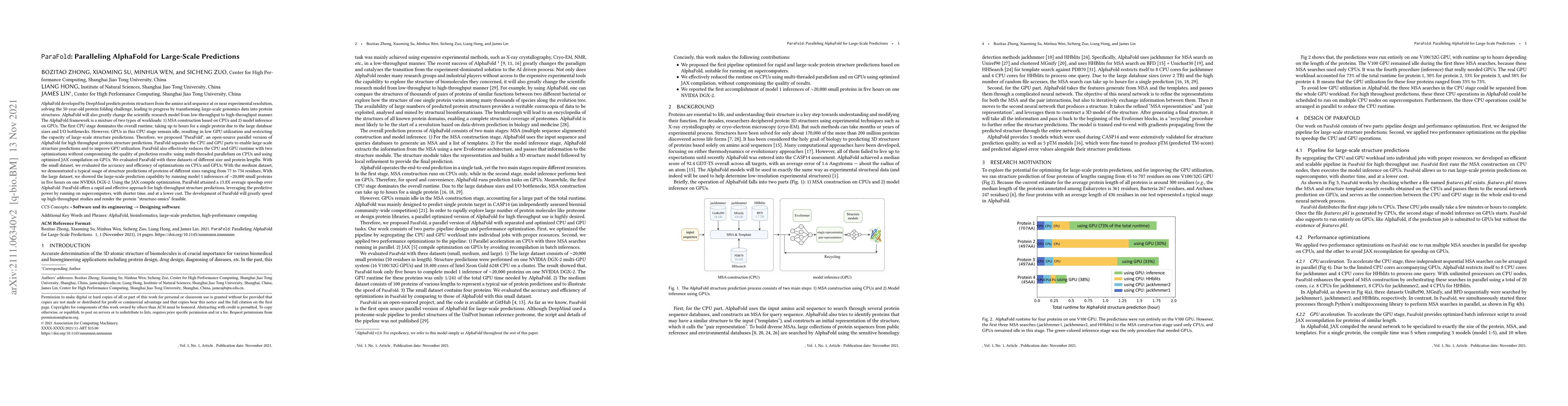 ParaFold is an open-source parallel version of AlphaFold designed to enhance high-throughput protein structure predictions by leveraging multi-threaded parallelism on CPUs and optimized JAX compilation on GPUs, achieving a 13.8X average speedup and enabling the prediction of 19,704 small proteins in five hours.