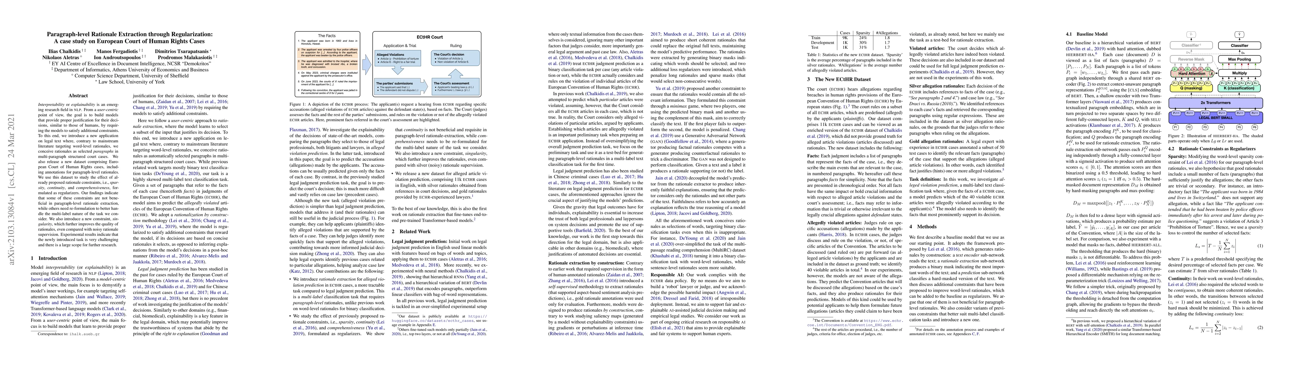 This paper explores interpretability in NLP through the extraction of paragraph-level rationales from European Court of Human Rights cases, introducing a new dataset and evaluating the effectiveness of various regularization constraints on this task. The study reveals that some constraints are not effective and proposes a new constraint, singularity, which enhances rationale quality.