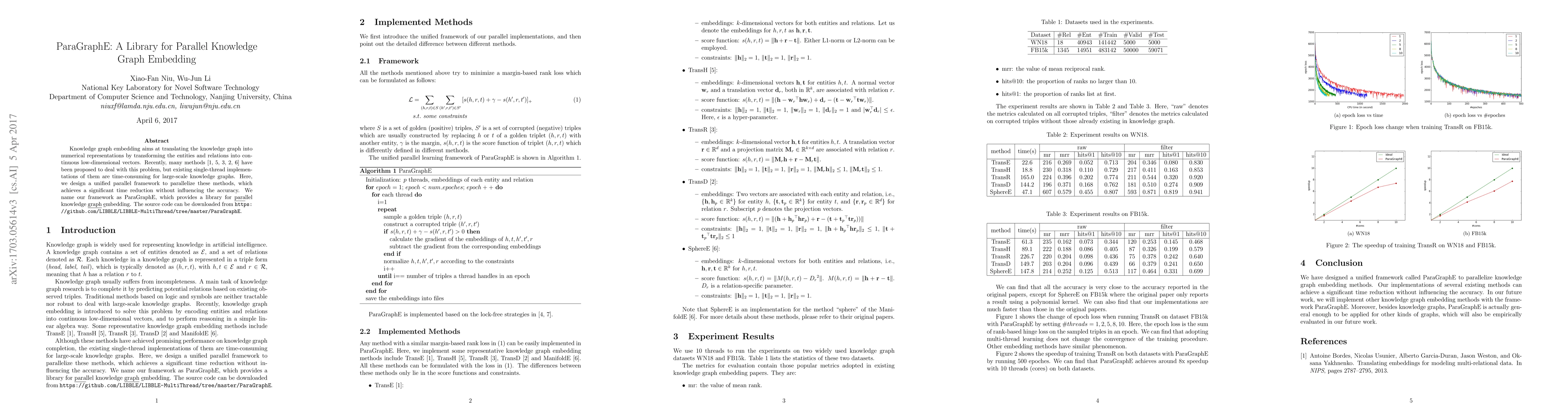 ParaGraphE is a library designed to parallelize knowledge graph embedding methods, significantly reducing computation time for large-scale knowledge graphs while maintaining accuracy. The source code is available for download on GitHub.