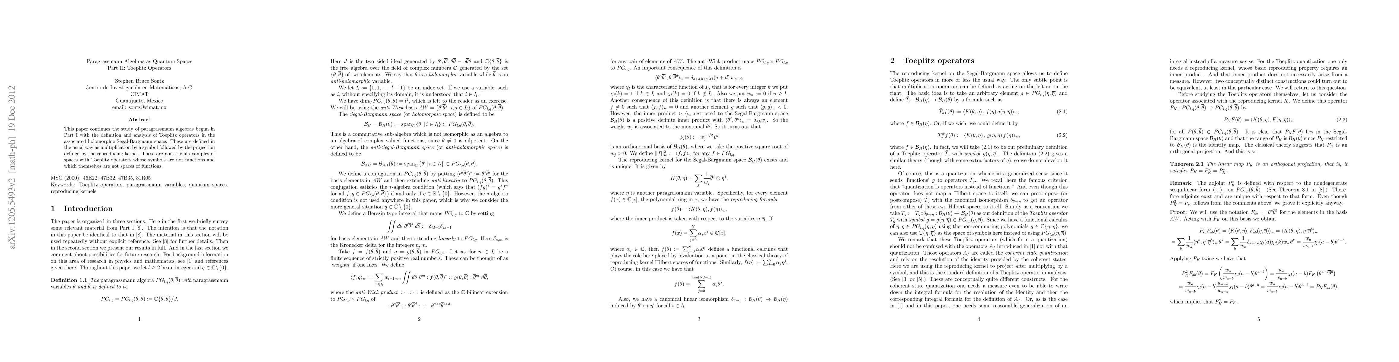This paper continues the study of paragrassmann algebras begun in Part I with the definition and analysis of Toeplitz operators in the associated holomorphic Segal-Bargmann space. These are defined in the usual way as multiplication by a symbol followed by the projection defined by the reproducing kernel. These are non-trivial examples of spaces with Toeplitz operators whose symbols are not functions and which themselves are not spaces of functions.