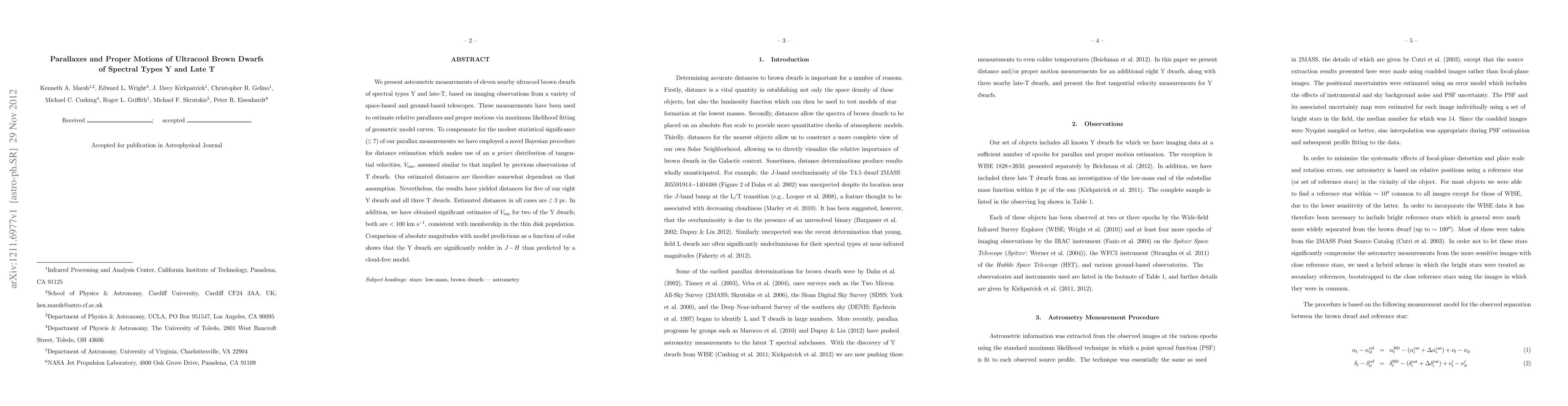This study presents astrometric measurements for eleven nearby ultracool brown dwarfs, yielding relative parallaxes and proper motions. A Bayesian procedure is used for distance estimation due to the limited statistical significance of parallax data, resulting in distances >3 pc for most objects and tangential velocities <100 km/s for two Y dwarfs, indicating thin disk membership.