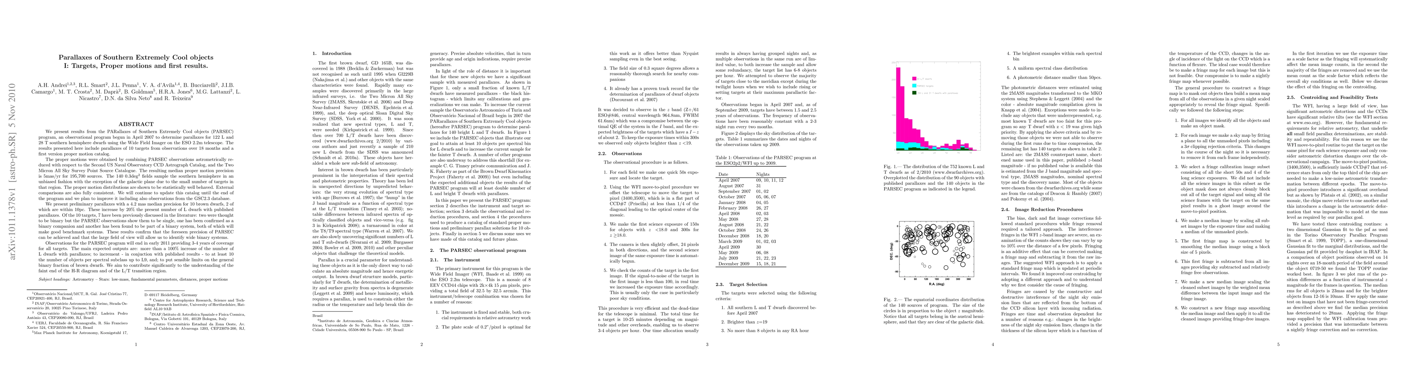 We present results from the PARallaxes of Southern Extremely Cool objects (PARSEC) program, an observational program begun in April 2007 to determine parallaxes for 122 L and 28 T southern hemisphere dwarfs using the Wide Field Imager on the ESO 2.2m telescope. The results presented here include parallaxes of 10 targets from observations over 18 months and a first version proper motion catalog. The proper motions were obtained by combining PARSEC observations astrometrically reduced with respect to the UCAC2 Catalog, and the 2MASS Catalog. The resulting median proper motion precision is 5mas/yr for 195,700 sources. The 140 0.3deg2 fields sample the southern hemisphere in an unbiased fashion with the exception of the galactic plane due to the small number of targets in that region. We present preliminary parallaxes with a 4.2 mas median precision for 10 brown dwarfs, 2 of which are within 10pc. These increase by 20% the present number of L dwarfs with published parallaxes. Of the 10 targets, 7 have been previously discussed in the literature: two were thought to be binary but the PARSEC observations show them to be single, one has been confirmed as a binary companion and another has been found to be part of a binary system, both of which will make good benchmark systems. Observations for the PARSEC program will end in early 2011 providing 3-4 years of coverage for all targets. The main expected outputs are: more than a 100% increase of the number of L dwarfs with parallaxes; to increment - in conjuction with published results - to at least 10 the number of objects per spectral subclass up to L9, and; to put sensible limits on the general binary fraction of brown dwarfs. We aim to contribute significantly to the understanding of the faint end of the H-R diagram and of the L/T transition region.