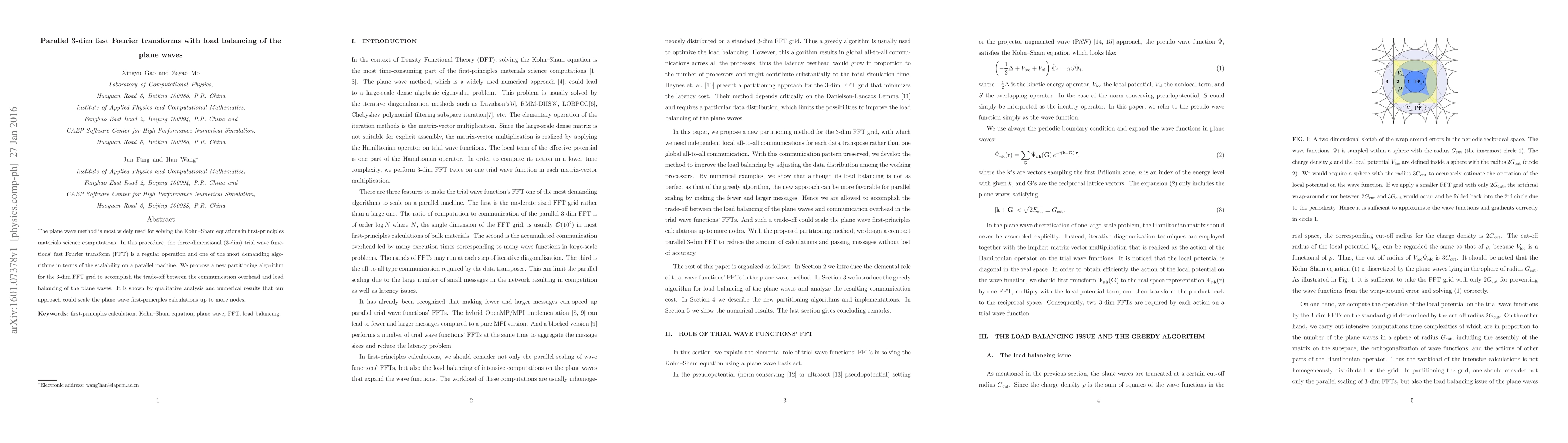 The plane wave method is most widely used for solving the Kohn-Sham equations in first-principles materials science computations. In this procedure, the three-dimensional (3-dim) trial wave functions' fast Fourier transform (FFT) is a regular operation and one of the most demanding algorithms in terms of the scalability on a parallel machine. We propose a new partitioning algorithm for the 3-dim FFT grid to accomplish the trade-off between the communication overhead and load balancing of the plane waves. It is shown by qualitative analysis and numerical results that our approach could scale the plane wave first-principles calculations up to more nodes.