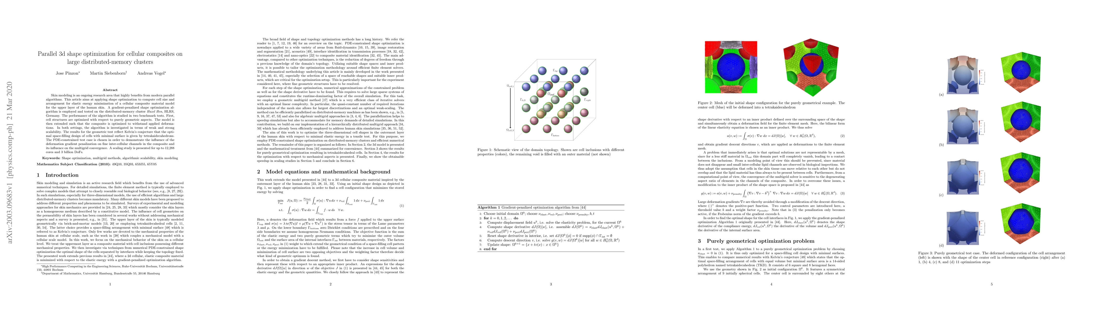 Skin modeling is an ongoing research area that highly benefits from modern parallel algorithms. This article aims at applying shape optimization to compute cell size and arrangement for elastic energy minimization of a cellular composite material model for the upper layer of the human skin. A gradient-penalized shape optimization algorithm is employed and tested on the distributed-memory cluster Hazel Hen, HLRS, Germany. The performance of the algorithm is studied in two benchmark tests. First, cell structures are optimized with respect to purely geometric aspects. The model is then extended such that the composite is optimized to withstand applied deformations. In both settings, the algorithm is investigated in terms of weak and strong scalability. The results for the geometric test reflect Kelvin's conjecture that the optimal space-filling design of cells with minimal surface is given by tetrakaidecahedrons. The PDE-constrained test case is chosen in order to demonstrate the influence of the deformation gradient penalization on fine inter-cellular channels in the composite and its influence on the multigrid convergence. A scaling study is presented for up to 12,288 cores and 3 billion DoFs.