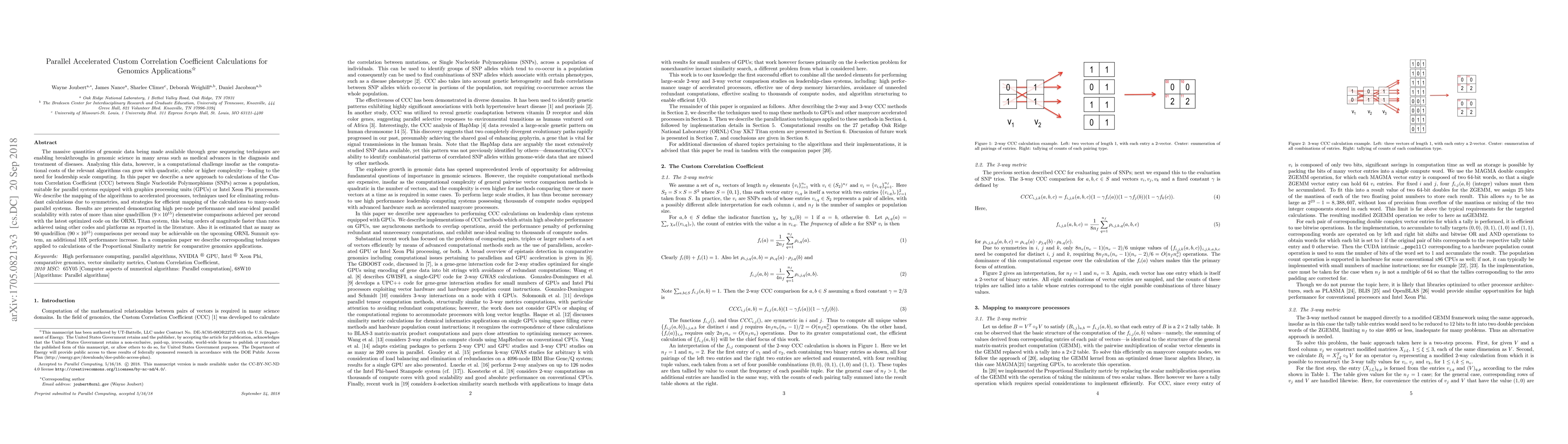 The massive quantities of genomic data being made available through gene sequencing techniques are enabling breakthroughs in genomic science in many areas such as medical advances in the diagnosis and treatment of diseases. Analyzing this data, however, is a computational challenge insofar as the computational costs of the relevant algorithms can grow with quadratic, cubic or higher complexity-leading to the need for leadership scale computing. In this paper we describe a new approach to calculations of the Custom Correlation Coefficient (CCC) between Single Nucleotide Polymorphisms (SNPs) across a population, suitable for parallel systems equipped with graphics processing units (GPUs) or Intel Xeon Phi processors. We describe the mapping of the algorithms to accelerated processors, techniques used for eliminating redundant calculations due to symmetries, and strategies for efficient mapping of the calculations to many-node parallel systems. Results are presented demonstrating high per-node performance and near-ideal parallel scalability with rates of more than nine quadrillion elementwise comparisons achieved per second with the latest optimized code on the ORNL Titan system, this being orders of magnitude faster than rates achieved using other codes and platforms as reported in the literature. Also it is estimated that as many as 90 quadrillion comparisons per second may be achievable on the upcoming ORNL Summit system, an additional 10X performance increase. In a companion paper we describe corresponding techniques applied to calculations of the Proportional Similarity metric for comparative genomics applications.