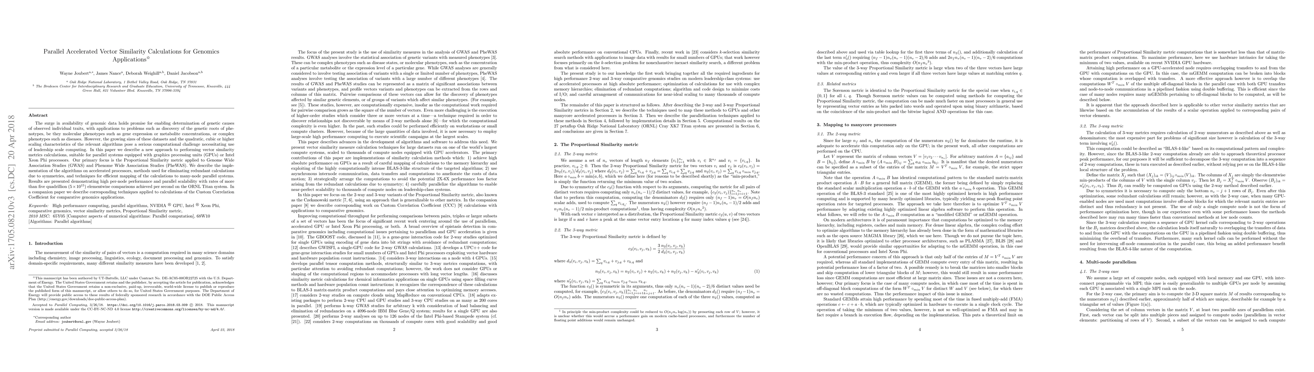 The surge in availability of genomic data holds promise for enabling determination of genetic causes of observed individual traits, with applications to problems such as discovery of the genetic roots of phenotypes, be they molecular phenotypes such as gene expression or metabolite concentrations, or complex phenotypes such as diseases. However, the growing sizes of these datasets and the quadratic, cubic or higher scaling characteristics of the relevant algorithms pose a serious computational challenge necessitating use of leadership scale computing. In this paper we describe a new approach to performing vector similarity metrics calculations, suitable for parallel systems equipped with graphics processing units (GPUs) or Intel Xeon Phi processors. Our primary focus is the Proportional Similarity metric applied to Genome Wide Association Studies (GWAS) and Phenome Wide Association Studies (PheWAS). We describe the implementation of the algorithms on accelerated processors, methods used for eliminating redundant calculations due to symmetries, and techniques for efficient mapping of the calculations to many-node parallel systems. Results are presented demonstrating high per-node performance and parallel scalability with rates of more than five quadrillion elementwise comparisons achieved per second on the ORNL Titan system. In a companion paper we describe corresponding techniques applied to calculations of the Custom Correlation Coefficient for comparative genomics applications.