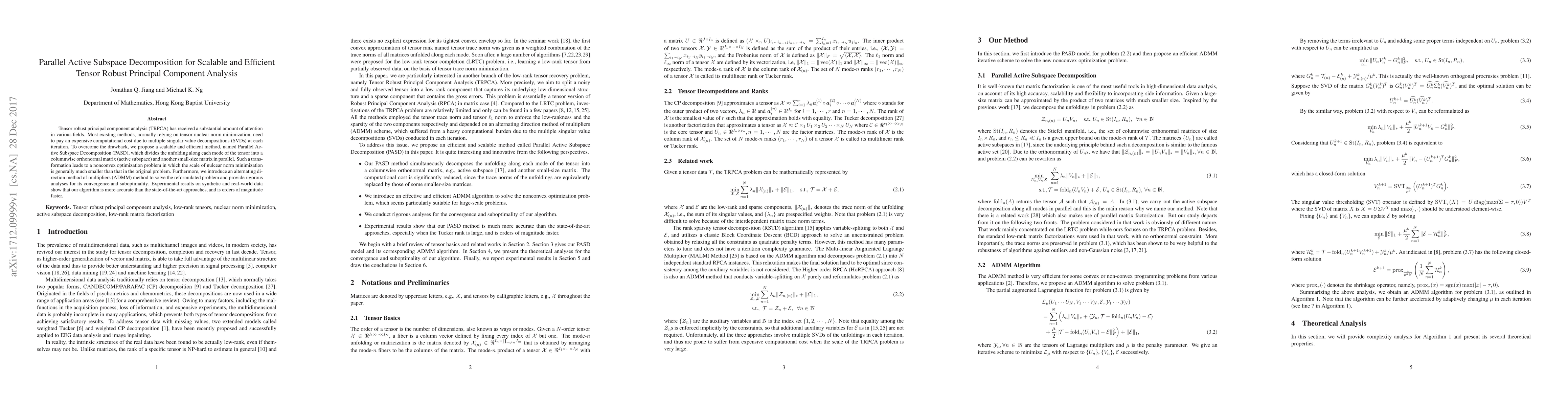 The paper proposes Parallel Active Subspace Decomposition (PASD) for scalable tensor robust principal component analysis (TRPCA), which efficiently reduces computational cost by transforming tensor unfolding into a smaller-scale nonconvex optimization problem. The method employs an ADMM approach for solution and demonstrates superior accuracy and speed compared to existing methods.