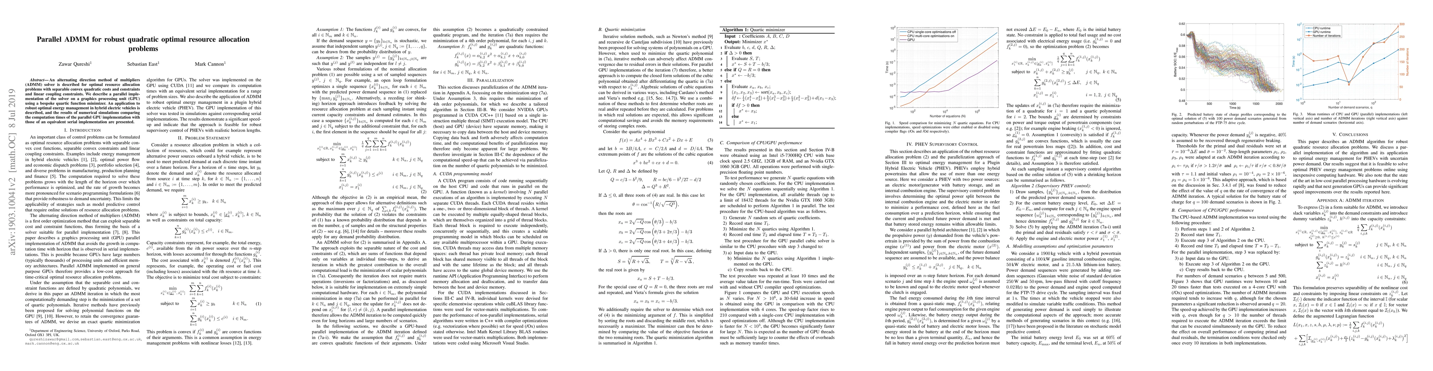 An alternating direction method of multipliers (ADMM) solver is described for optimal resource allocation problems with separable convex quadratic costs and constraints and linear coupling constraints. We describe a parallel implementation of the solver on a graphics processing unit (GPU) using a bespoke quartic function minimizer. An application to robust optimal energy management in hybrid electric vehicles is described, and the results of numerical simulations comparing the computation times of the parallel GPU implementation with those of an equivalent serial implementation are presented.