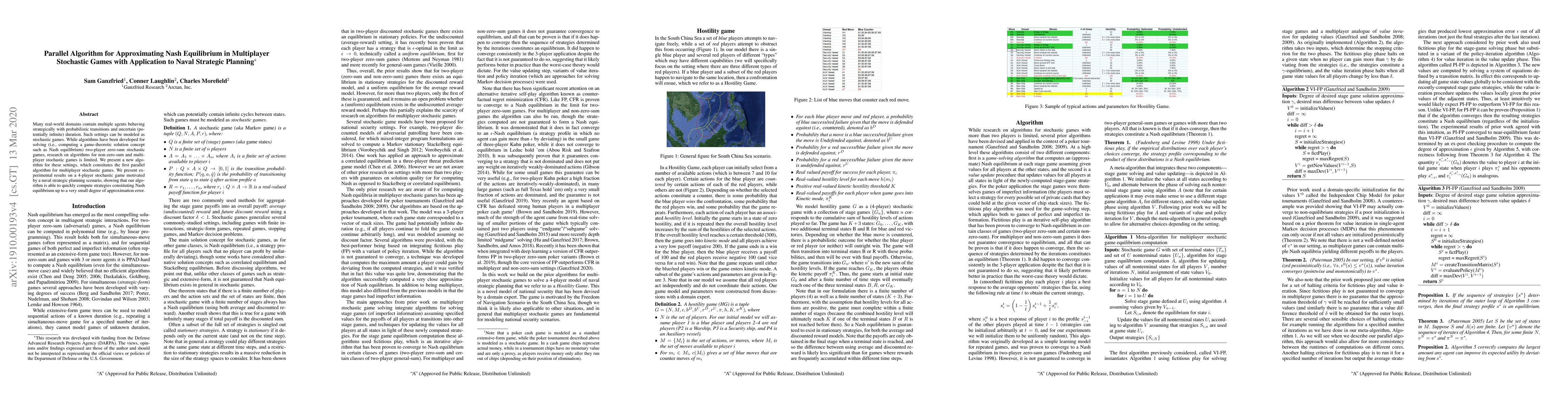 This paper introduces a novel parallel algorithm for approximating Nash equilibrium in multiplayer stochastic games, addressing the lack of research in this area. Experimental results on a 4-player naval strategic planning scenario demonstrate the algorithm's efficiency in computing near-optimal strategies.