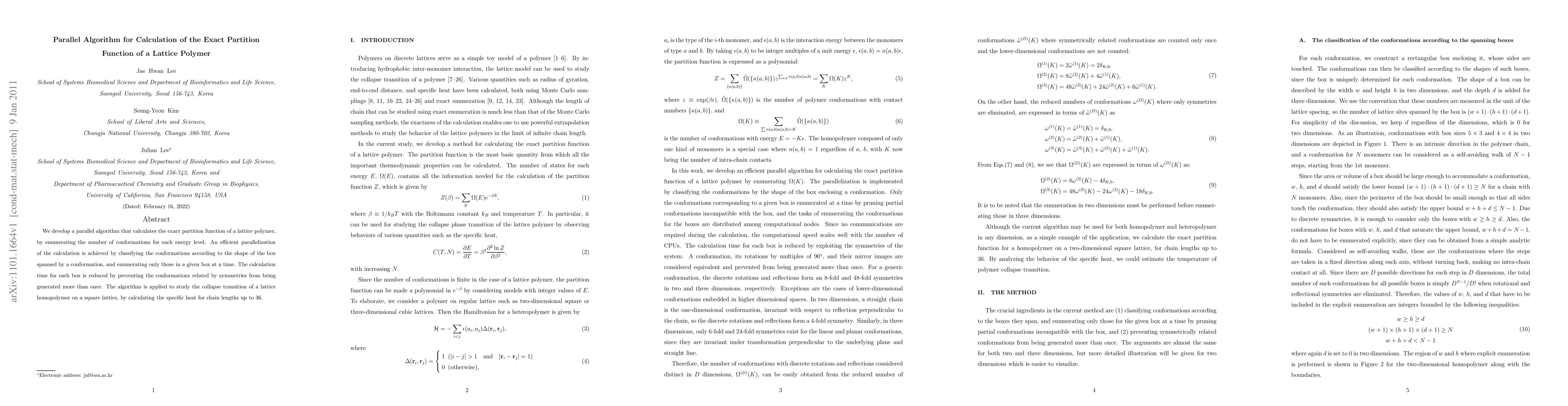 This paper presents a parallel algorithm for calculating the exact partition function of a lattice polymer by enumerating conformations, optimizing parallelization through shape classification, and reducing redundancy via symmetry considerations. The algorithm is tested for the collapse transition of a lattice homopolymer, calculating specific heat for chain lengths up to 36.