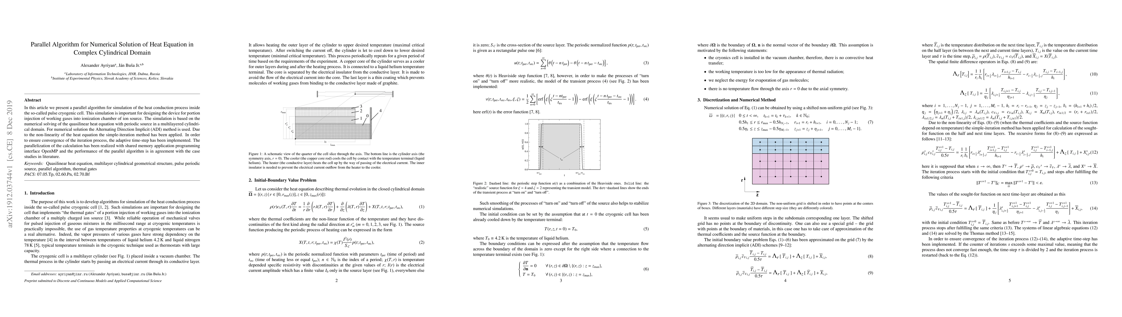 This paper presents a parallel algorithm using the Alternating Direction Implicit (ADI) method for solving the quasilinear heat equation in a complex cylindrical domain, crucial for designing cryogenic pulse cells. The method employs OpenMP for parallelization and adaptive time-stepping to ensure convergence.