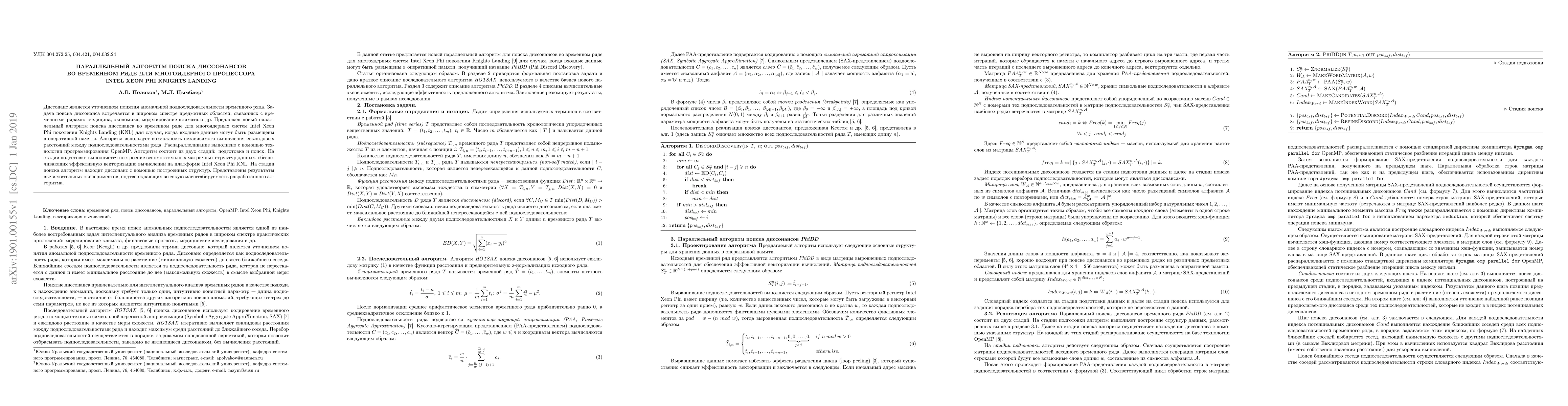 Discord is a refinement of the concept of anomalous subsequence of a time series. The task of discords discovery is applied in a wide range of subject domains related to time series: medicine, economics, climate modeling, etc. In this paper, we propose a novel parallel algorithm for discords discovery for the Intel Xeon Phi Knights Landing (KNL) many-core systems for the case when input data fit in main memory. The algorithm exploits the ability to independently calculate Euclidean distances between the subsequences of the time series. Computations are paralleled through OpenMP technology. The algorithm consists of two stages, namely precomputations and discovery. At the precomputations stage, we construct the auxiliary matrix data structures, which ensure efficient vectorization of computations on Intel Xeon Phi KNL. At the discovery stage, the algorithm finds discord based upon the structures above. Experimental evaluation confirms the high scalability of the developed algorithm.