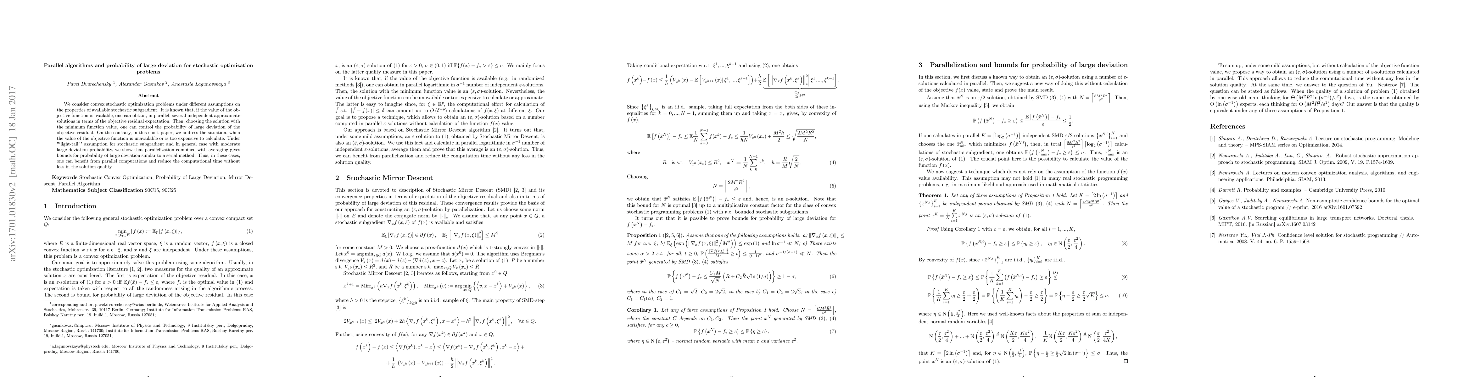 We consider convex stochastic optimization problems under different assumptions on the properties of available stochastic subgradient. It is known that, if the value of the objective function is available, one can obtain, in parallel, several independent approximate solutions in terms of the objective residual expectation. Then, choosing the solution with the minimum function value, one can control the probability of large deviation of the objective residual. On the contrary, in this short paper, we address the situation, when the value of the objective function is unavailable or is too expensive to calculate. Under "`light-tail"' assumption for stochastic subgradient and in general case with moderate large deviation probability, we show that parallelization combined with averaging gives bounds for probability of large deviation similar to a serial method. Thus, in these cases, one can benefit from parallel computations and reduce the computational time without loss in the solution quality.