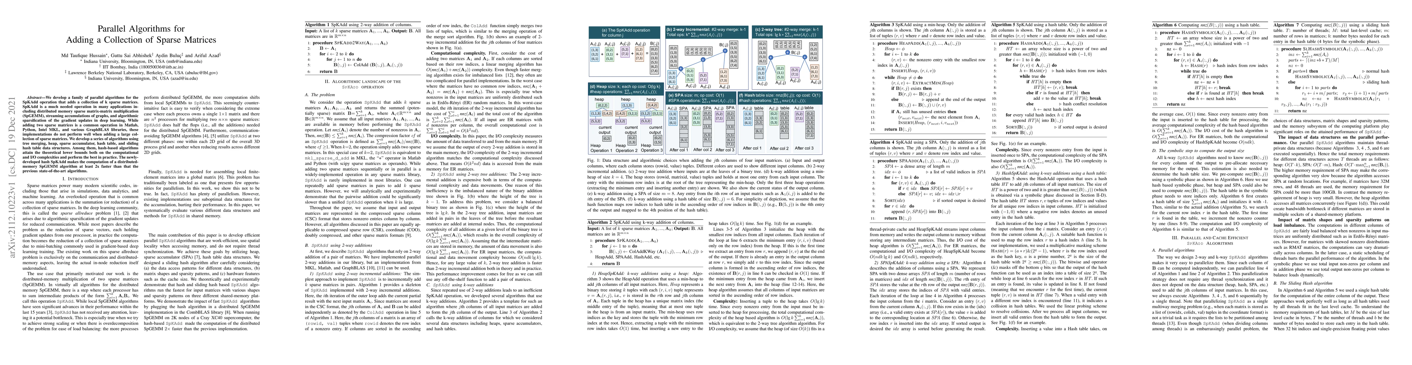 This paper presents parallel algorithms for the SpKAdd operation, which adds a collection of sparse matrices, addressing inefficiencies in existing implementations. The proposed hash-based algorithms achieve optimal computational and I/O complexities, significantly improving the performance of distributed-memory sparse matrix-matrix multiplication.