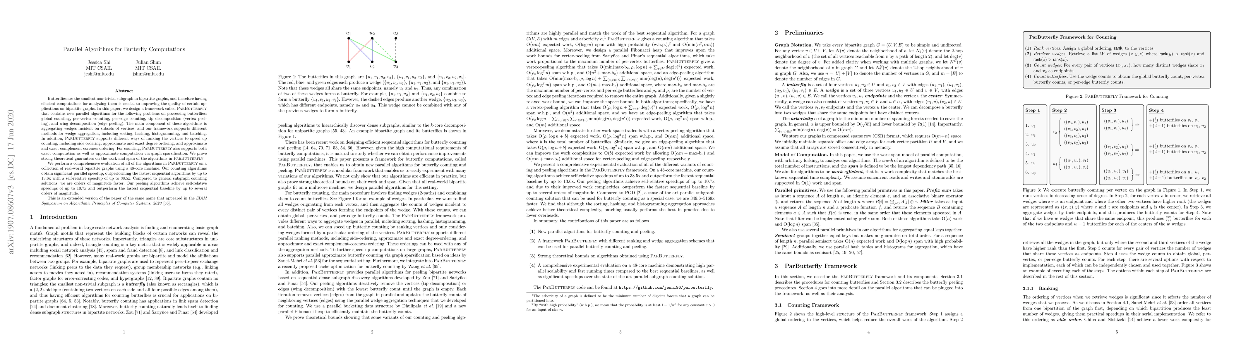 Butterflies are the smallest non-trivial subgraph in bipartite graphs, and therefore having efficient computations for analyzing them is crucial to improving the quality of certain applications on bipartite graphs. In this paper, we design a framework called ParButterfly that contains new parallel algorithms for the following problems on processing butterflies: global counting, per-vertex counting, per-edge counting, tip decomposition (vertex peeling), and wing decomposition (edge peeling). The main component of these algorithms is aggregating wedges incident on subsets of vertices, and our framework supports different methods for wedge aggregation, including sorting, hashing, histogramming, and batching. In addition, ParButterfly supports different ways of ranking the vertices to speed up counting, including side ordering, approximate and exact degree ordering, and approximate and exact complement coreness ordering. For counting, ParButterfly also supports both exact computation as well as approximate computation via graph sparsification. We prove strong theoretical guarantees on the work and span of the algorithms in ParButterfly. We perform a comprehensive evaluation of all of the algorithms in ParButterfly on a collection of real-world bipartite graphs using a 48-core machine. Our counting algorithms obtain significant parallel speedup, outperforming the fastest sequential algorithms by up to 13.6x with a self-relative speedup of up to 38.5x. Compared to general subgraph counting solutions, we are orders of magnitude faster. Our peeling algorithms achieve self-relative speedups of up to 10.7x and outperform the fastest sequential baseline by up to several orders of magnitude.
