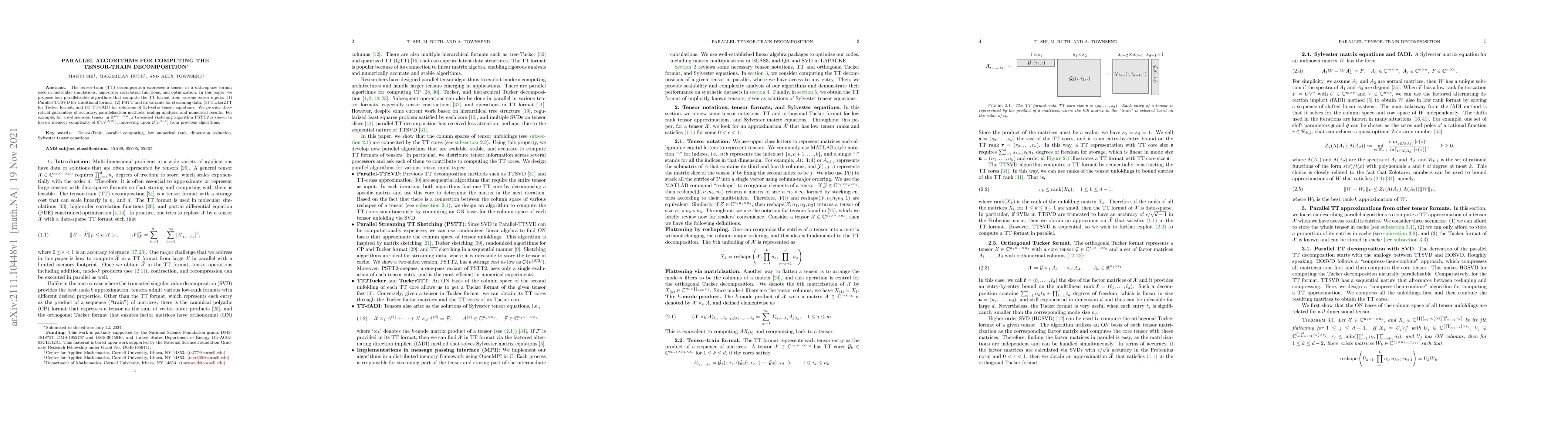This paper proposes four parallel algorithms for computing the tensor-train (TT) decomposition, enhancing computational efficiency in data-sparse formats. It introduces Parallel-TTSVD, PSTT, Tucker2TT, and TT-fADI, with theoretical accuracy guarantees and improved memory complexity for large tensors.