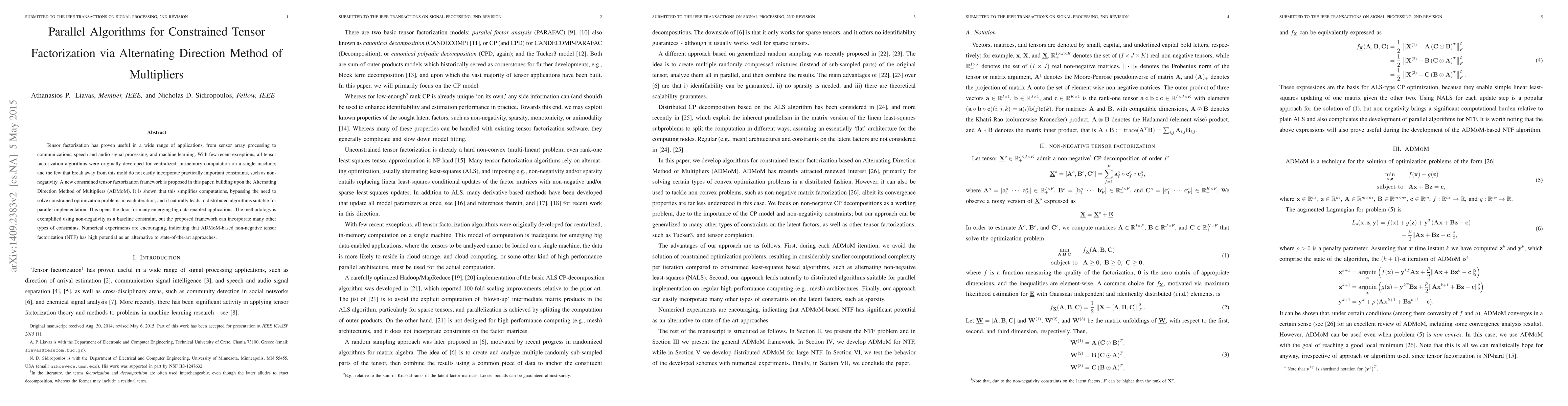 This paper proposes a new constrained tensor factorization framework using the Alternating Direction Method of Multipliers (ADMoM) that simplifies computations and enables parallel implementation on high-performance computing architectures. Numerical experiments show promising results for the ADMoM-based nonnegative tensor factorization (NTF) as a competitive alternative to existing methods.