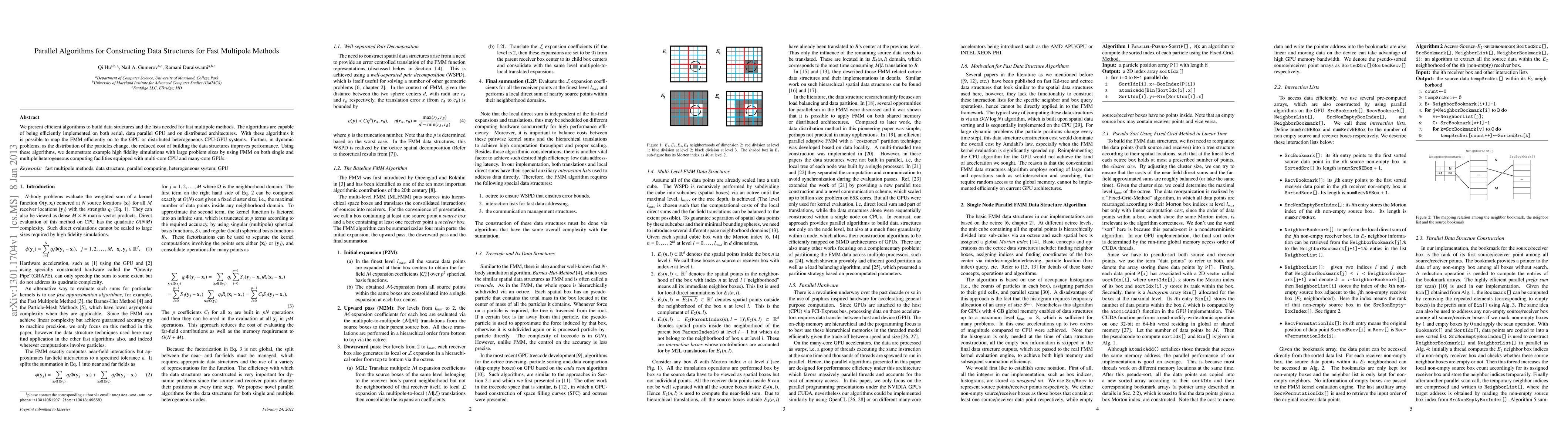 This paper introduces parallel algorithms for constructing data structures essential for fast multipole methods (FMM), enabling efficient implementation on serial, GPU, and distributed architectures. These algorithms improve performance in dynamic problems by reducing the cost of rebuilding data structures, demonstrated through high-fidelity simulations on heterogeneous computing systems.