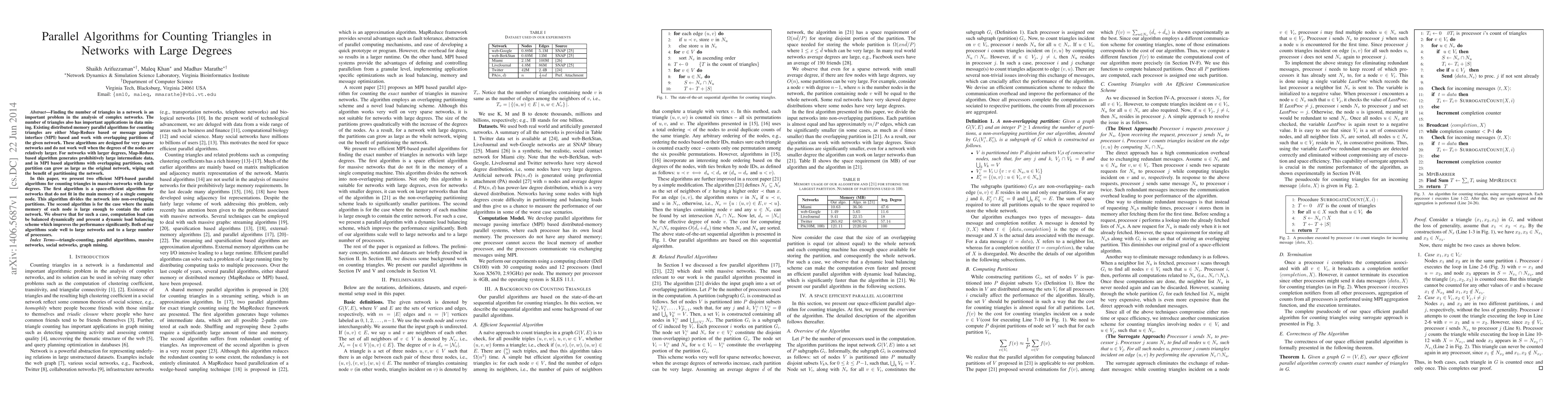 This paper introduces two MPI-based parallel algorithms for efficiently counting triangles in large networks with high node degrees. The first algorithm uses non-overlapping partitions for memory-constrained networks, while the second employs dynamic load balancing for networks that fit within node memory, significantly improving performance. Both algorithms scale effectively with large networks and numerous processors.