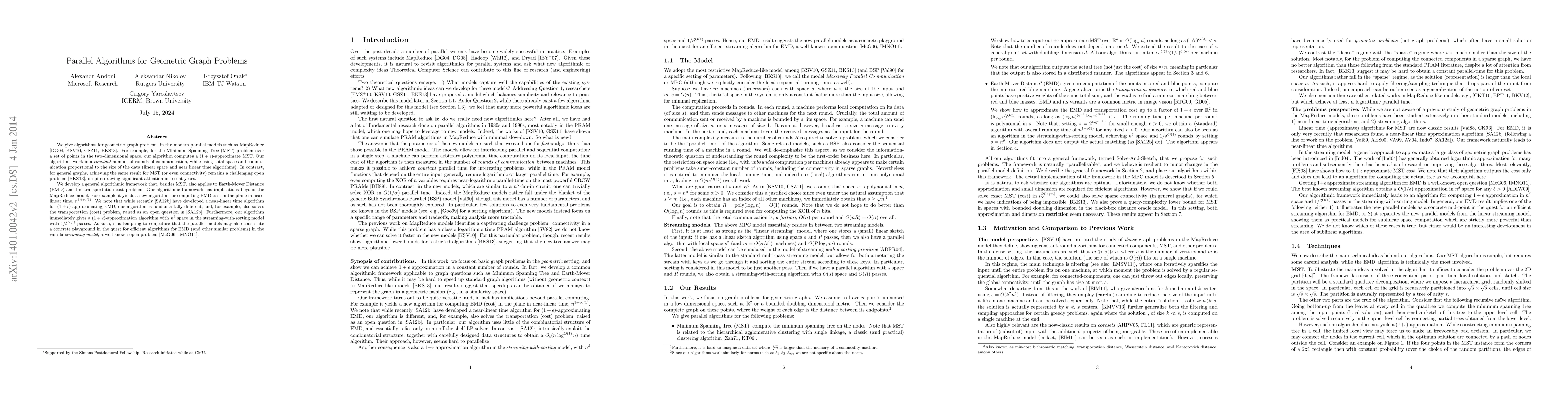 We give algorithms for geometric graph problems in the modern parallel models inspired by MapReduce. For example, for the Minimum Spanning Tree (MST) problem over a set of points in the two-dimensional space, our algorithm computes a $(1+\epsilon)$-approximate MST. Our algorithms work in a constant number of rounds of communication, while using total space and communication proportional to the size of the data (linear space and near linear time algorithms). In contrast, for general graphs, achieving the same result for MST (or even connectivity) remains a challenging open problem, despite drawing significant attention in recent years. We develop a general algorithmic framework that, besides MST, also applies to Earth-Mover Distance (EMD) and the transportation cost problem. Our algorithmic framework has implications beyond the MapReduce model. For example it yields a new algorithm for computing EMD cost in the plane in near-linear time, $n^{1+o_\epsilon(1)}$. We note that while recently Sharathkumar and Agarwal developed a near-linear time algorithm for $(1+\epsilon)$-approximating EMD, our algorithm is fundamentally different, and, for example, also solves the transportation (cost) problem, raised as an open question in their work. Furthermore, our algorithm immediately gives a $(1+\epsilon)$-approximation algorithm with $n^{\delta}$ space in the streaming-with-sorting model with $1/\delta^{O(1)}$ passes. As such, it is tempting to conjecture that the parallel models may also constitute a concrete playground in the quest for efficient algorithms for EMD (and other similar problems) in the vanilla streaming model, a well-known open problem.