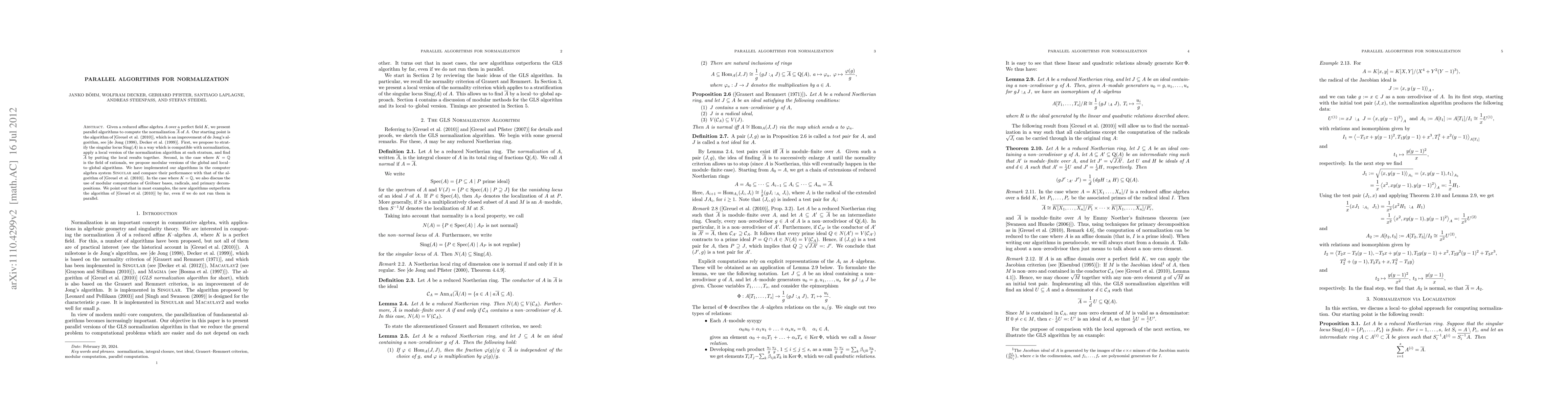 Given a reduced affine algebra A over a perfect field K, we present parallel algorithms to compute the normalization \bar{A} of A. Our starting point is the algorithm of Greuel, Laplagne, and Seelisch, which is an improvement of de Jong's algorithm. First, we propose to stratify the singular locus Sing(A) in a way which is compatible with normalization, apply a local version of the normalization algorithm at each stratum, and find \bar{A} by putting the local results together. Second, in the case where K = Q is the field of rationals, we propose modular versions of the global and local-to-global algorithms. We have implemented our algorithms in the computer algebra system SINGULAR and compare their performance with that of the algorithm of Greuel, Laplagne, and Seelisch. In the case where K = Q, we also discuss the use of modular computations of Groebner bases, radicals, and primary decompositions. We point out that in most examples, the new algorithms outperform the algorithm of Greuel, Laplagne, and Seelisch by far, even if we do not run them in parallel.