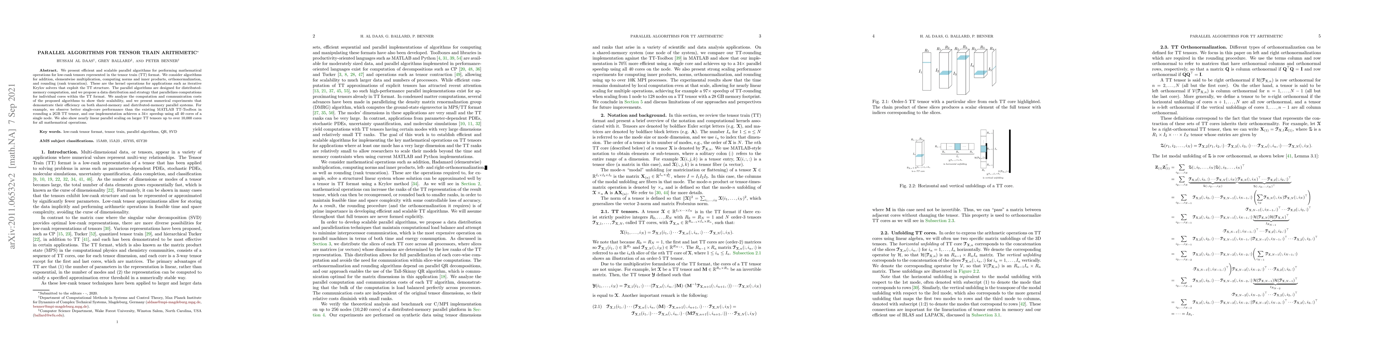 This paper introduces scalable parallel algorithms for various tensor train (TT) arithmetic operations, including addition, multiplication, and norms, designed for distributed-memory systems. The proposed algorithms demonstrate significant speedups and nearly linear scaling on large TT tensors, outperforming existing MATLAB implementations.
