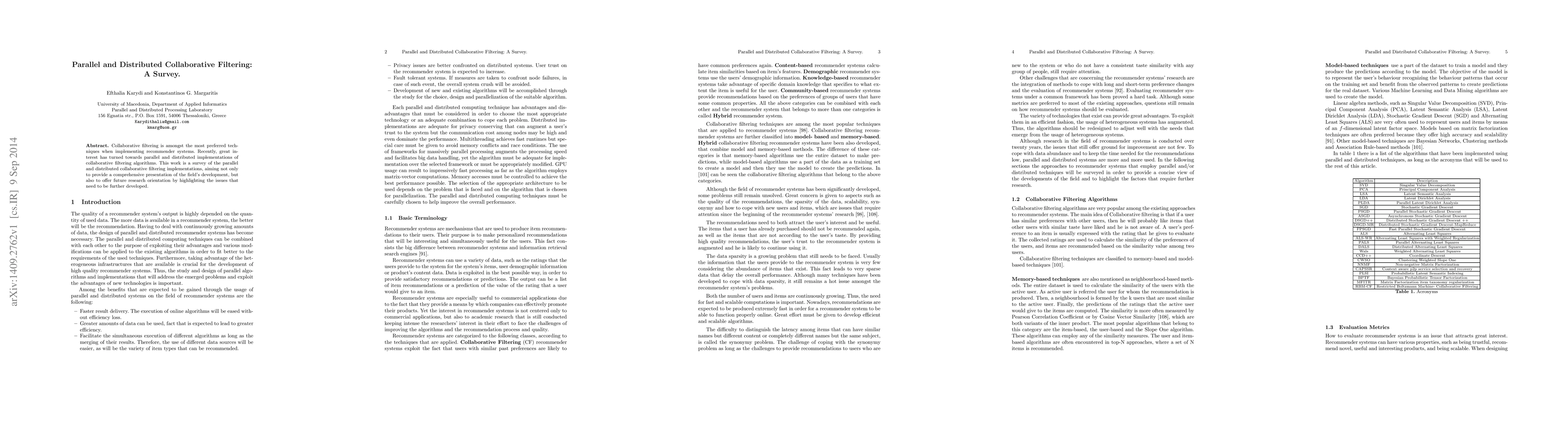 This paper surveys parallel and distributed implementations of collaborative filtering algorithms used in recommender systems, offering a comprehensive overview of current developments and identifying key areas for future research.