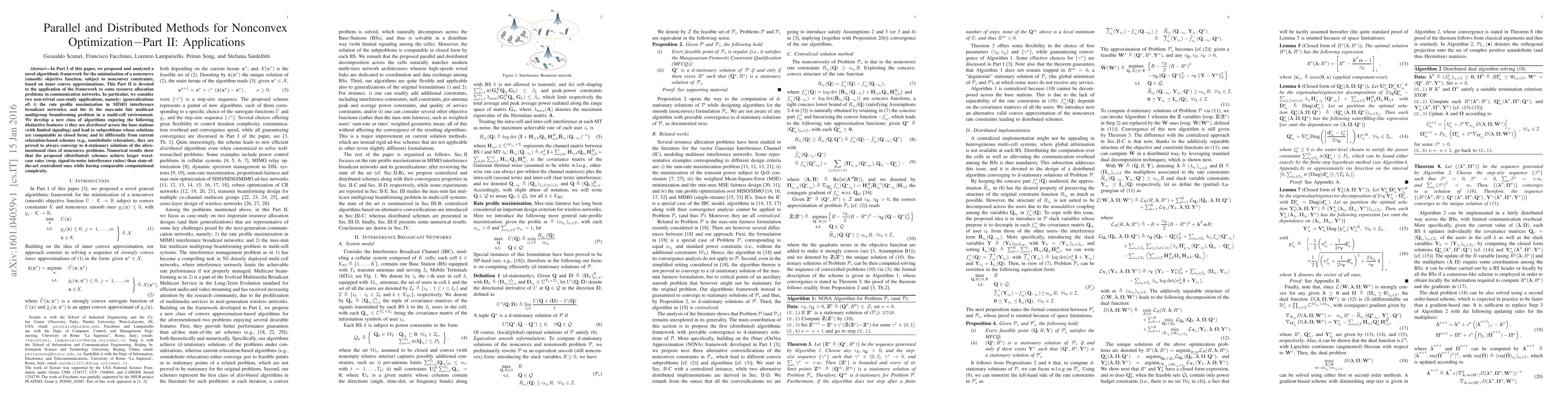 In Part I of this paper, we proposed and analyzed a novel algorithmic framework for the minimization of a nonconvex (smooth) objective function, subject to nonconvex constraints, based on inner convex approximations. This Part II is devoted to the application of the framework to some resource allocation problems in communication networks. In particular, we consider two non-trivial case-study applications, namely: (generalizations of) i) the rate profile maximization in MIMO interference broadcast networks; and the ii) the max-min fair multicast multigroup beamforming problem in a multi-cell environment. We develop a new class of algorithms enjoying the following distinctive features: i) they are \emph{distributed} across the base stations (with limited signaling) and lead to subproblems whose solutions are computable in closed form; and ii) differently from current relaxation-based schemes (e.g., semidefinite relaxation), they are proved to always converge to d-stationary solutions of the aforementioned class of nonconvex problems. Numerical results show that the proposed (distributed) schemes achieve larger worst-case rates (resp. signal-to-noise interference ratios) than state-of-the-art centralized ones while having comparable computational complexity.