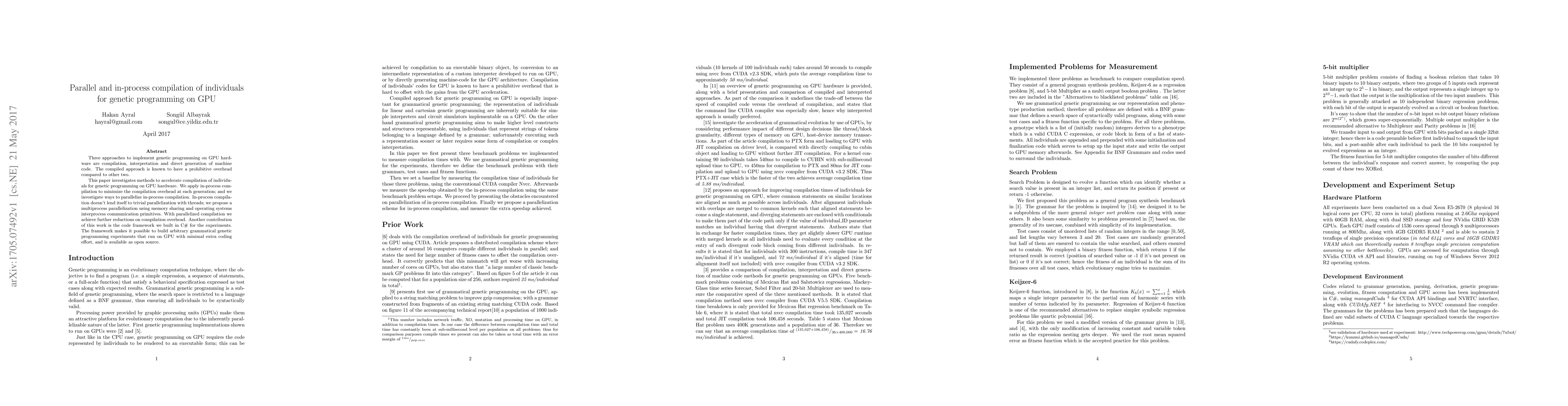 This paper explores methods to accelerate the compilation process for genetic programming on GPU hardware, proposing in-process compilation and multiprocess parallelization to minimize overhead. The authors developed a C# framework for GPU-based genetic programming experiments, available as open source.
