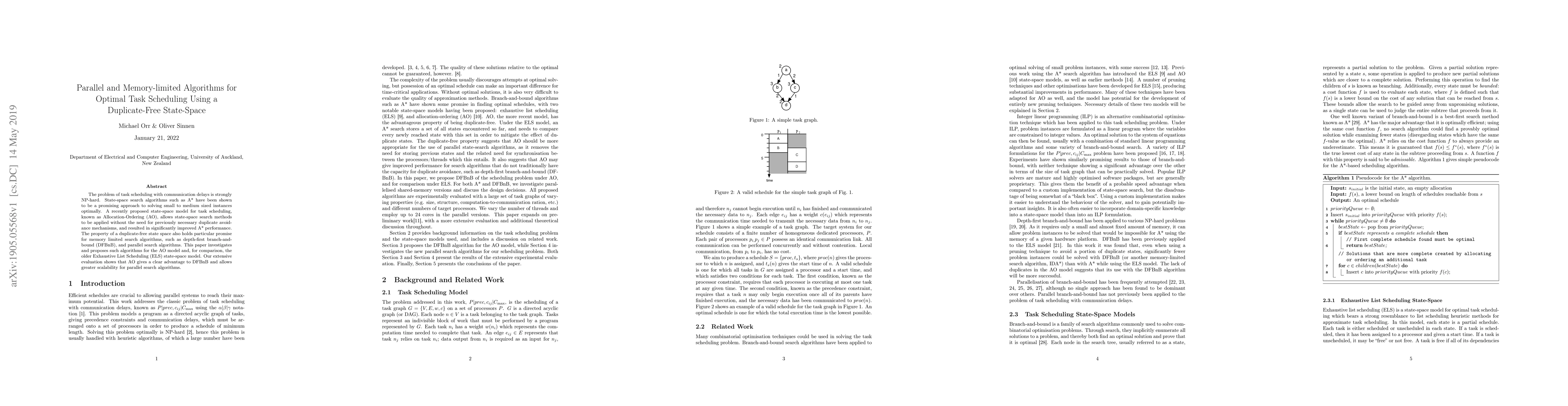 The problem of task scheduling with communication delays is strongly NP-hard. State-space search algorithms such as A* have been shown to be a promising approach to solving small to medium sized instances optimally. A recently proposed state-space model for task scheduling, known as Allocation-Ordering (AO), allows state-space search methods to be applied without the need for previously necessary duplicate avoidance mechanisms, and resulted in significantly improved A* performance. The property of a duplicate-free state space also holds particular promise for memory limited search algorithms, such as depth-first branch-and-bound (DFBnB), and parallel search algorithms. This paper investigates and proposes such algorithms for the AO model and, for comparison, the older Exhaustive List Scheduling (ELS) state-space model. Our extensive evaluation shows that AO gives a clear advantage to DFBnB and allows greater scalability for parallel search algorithms.