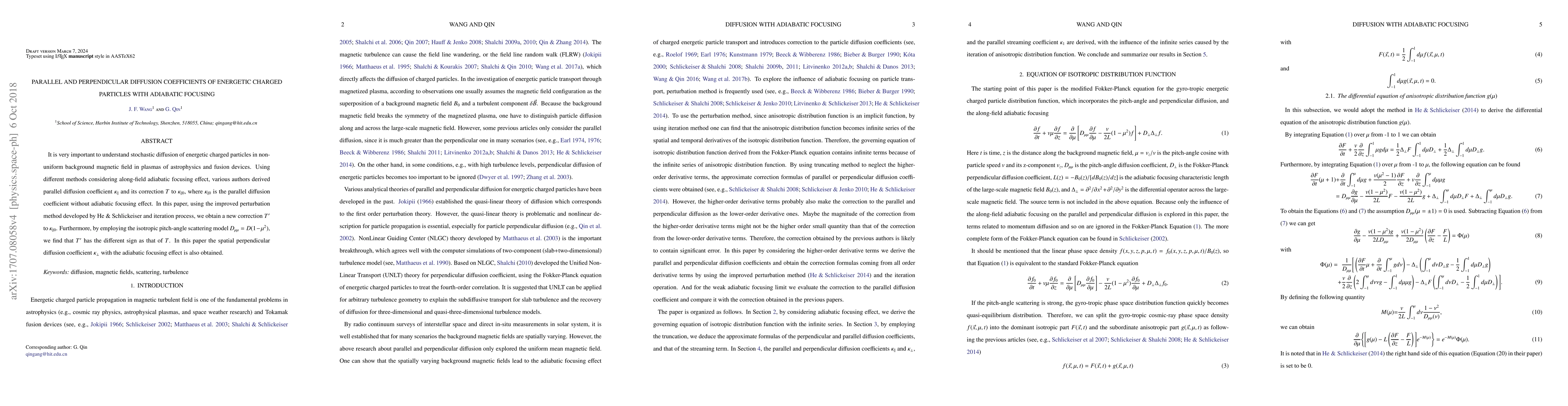 This paper develops a new correction $T'$ to the parallel diffusion coefficient $\kappa_{\parallel 0}$ using an improved perturbation method and iteration process. It also derives the spatial perpendicular diffusion coefficient $\kappa_\bot$ for energetic charged particles in non-uniform magnetic fields, considering the effects of adiabatic focusing and isotropic pitch-angle scattering.