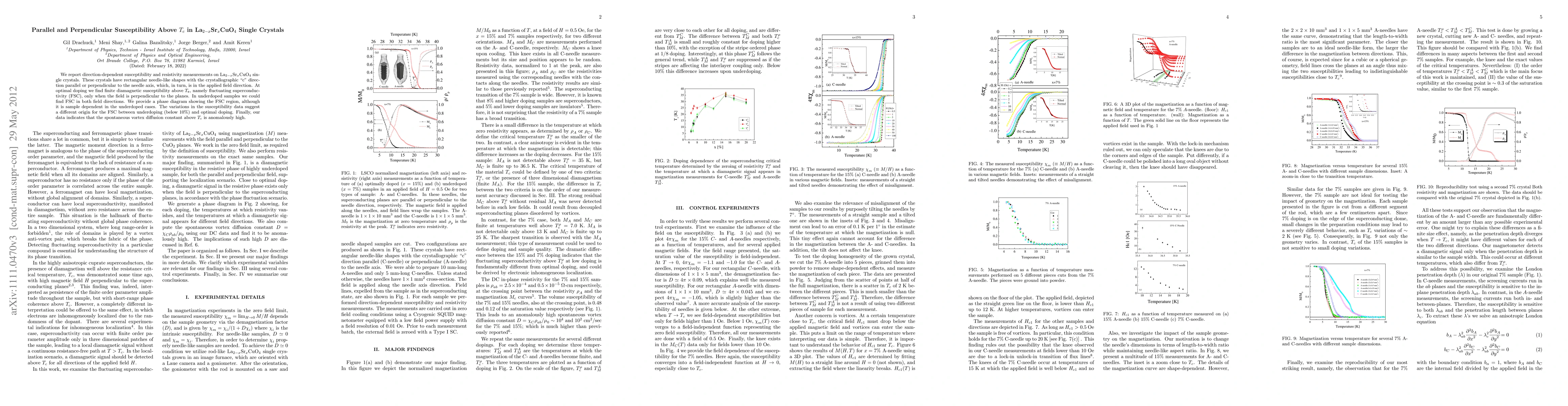 We report direction-dependent susceptibility and resistivity measurements on La$_{2-x}$Sr$_{x}$CuO$_{4}$ single crystals. These crystals have rectangular needle-like shapes with the crystallographic "c" direction parallel or perpendicular to the needle axis,which, in turn, is in the applied field direction. At optimal doping we find finite diamagnetic susceptibility above $T_{c}$, namely fluctuating superconductivity (FSC), only when the field is perpendicular to the planes. In underdoped samples we could find FSC in both field directions. We provide a phase diagram showing the FSC region, although it is sample dependent in the underdoped cases. The variations in the susceptibility data suggest a different origin for the FSC between underdoping (below 10%) and optimal doping. Finally, our data indicates that the spontaneous vortex diffusion constant above $T_c$ is anomalously high.