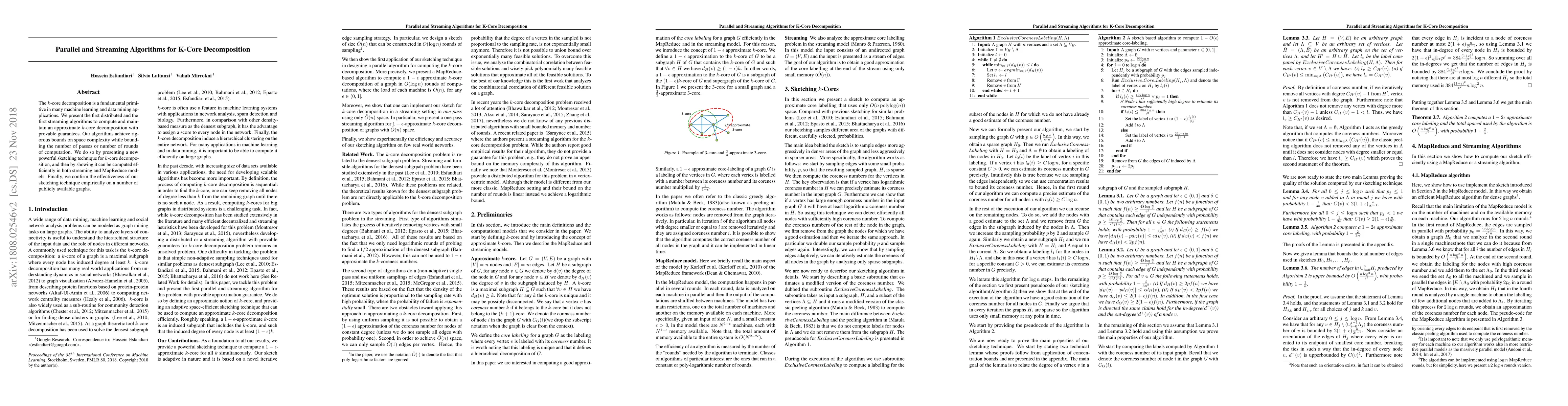 This paper presents distributed and streaming algorithms for k-core decomposition with provable guarantees, achieving rigorous bounds on space complexity.