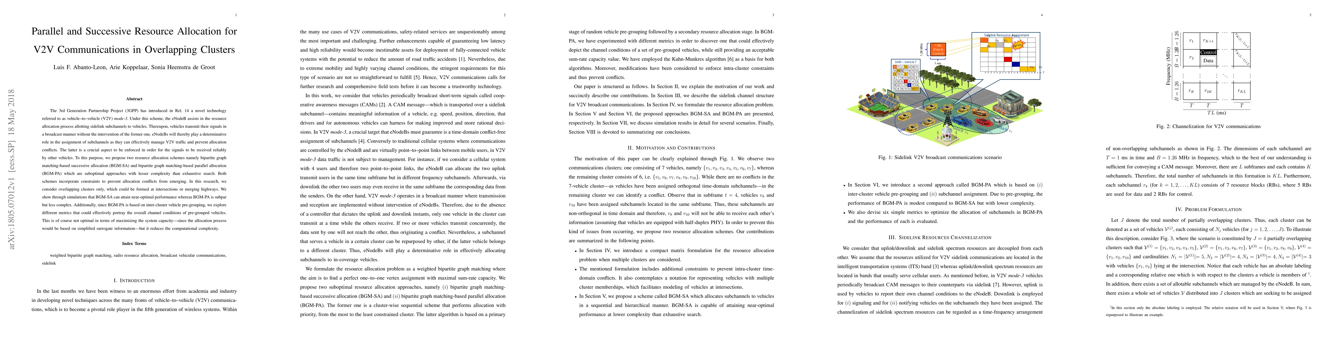 The 3rd Generation Partnership Project (3GPP) has introduced in Rel. 14 a novel technology referred to as vehicle--to--vehicle (V2V) \textit{mode-3}. Under this scheme, the eNodeB assists in the resource allocation process allotting sidelink subchannels to vehicles. Thereupon, vehicles transmit their signals in a broadcast manner without the intervention of the former one. eNodeBs will thereby play a determinative role in the assignment of subchannels as they can effectively manage V2V traffic and prevent allocation conflicts. The latter is a crucial aspect to be enforced in order for the signals to be received reliably by other vehicles. To this purpose, we propose two resource allocation schemes namely bipartite graph matching-based successive allocation (BGM-SA) and bipartite graph matching-based parallel allocation (BGM-PA) which are suboptimal approaches with lesser complexity than exhaustive search. Both schemes incorporate constraints to prevent allocation conflicts from emerging. In this research, we consider overlapping clusters only, which could be formed at intersections or merging highways. We show through simulations that BGM-SA can attain near-optimal performance whereas BGM-PA is subpar but less complex. Additionally, since BGM-PA is based on inter-cluster vehicle pre-grouping, we explore different metrics that could effectively portray the overall channel conditions of pre-grouped vehicles. This is of course not optimal in terms of maximizing the system capacity---since the allocation process would be based on simplified surrogate information---but it reduces the computational complexity.