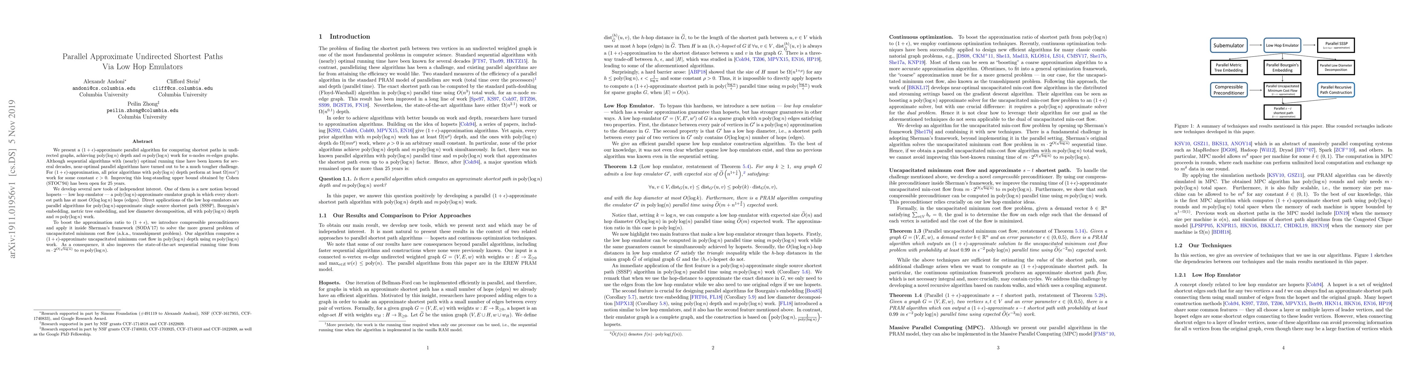 This paper presents a $(1+\varepsilon)$-approximate parallel algorithm for computing shortest paths in undirected graphs, achieving polylogarithmic depth and $m\mathrm{poly}(\log n)$ work. It introduces low hop emulators and compressible preconditioners to improve upon previous bounds and extend the approximation to uncapacitated minimum cost flow.
