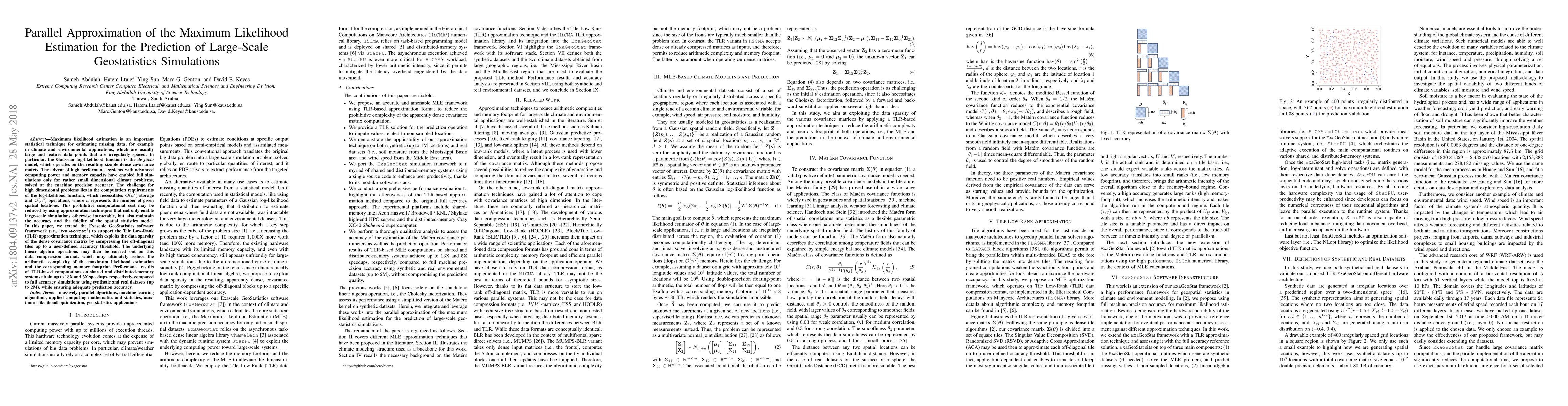 This paper proposes a parallel approximation technique, Tile Low-Rank (TLR), to efficiently compute maximum likelihood estimation in large-scale geostatistics simulations. The TLR method reduces computational complexity and memory usage by exploiting data sparsity in the covariance matrix, achieving up to 13X speedups on shared systems and 5X on distributed systems while maintaining prediction accuracy.