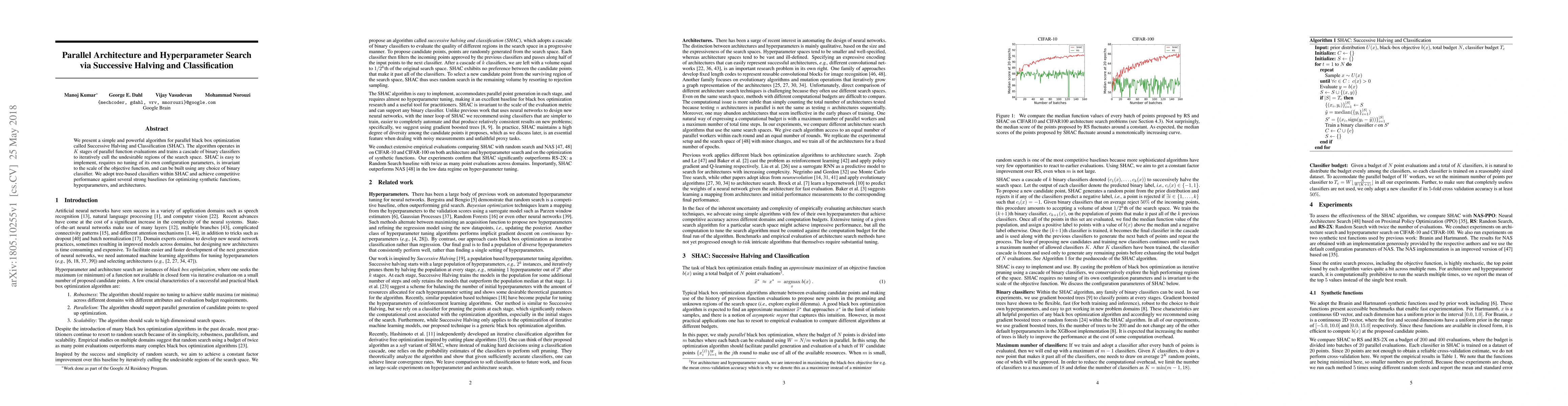 The paper introduces Successive Halving and Classification (SHAC), an easy-to-implement algorithm for parallel optimization. SHAC uses a cascade of binary classifiers to eliminate unwanted search space regions across K stages, requiring no tuning and working with any classifier choice. It effectively optimizes synthetic functions, hyperparameters, and architectures, demonstrating competitive performance against strong baselines.