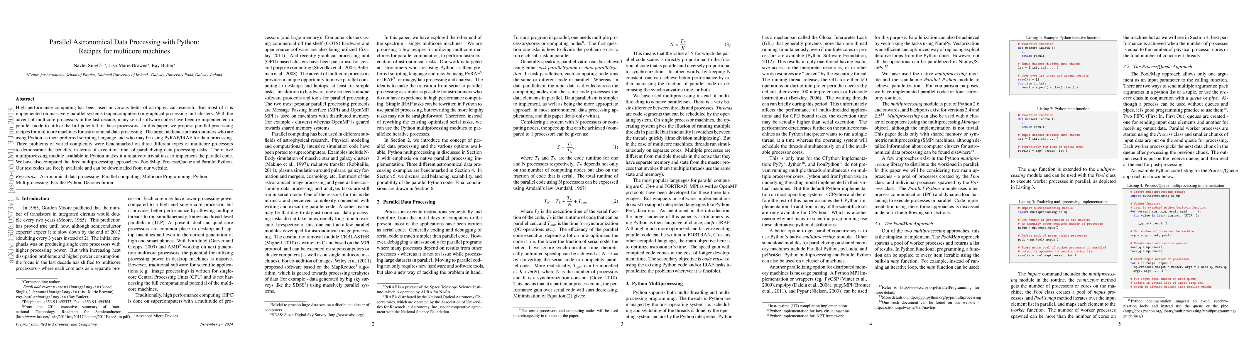 This research paper proposes parallel processing techniques for astronomical data using Python on multicore machines. It benchmarks three complex problems on different multicore processors, showcasing the execution time benefits of parallelizing data tasks. The native Python multiprocessing module is highlighted for its ease of implementation, and three multiprocessing approaches are compared for efficiency. Test codes are freely available for download.