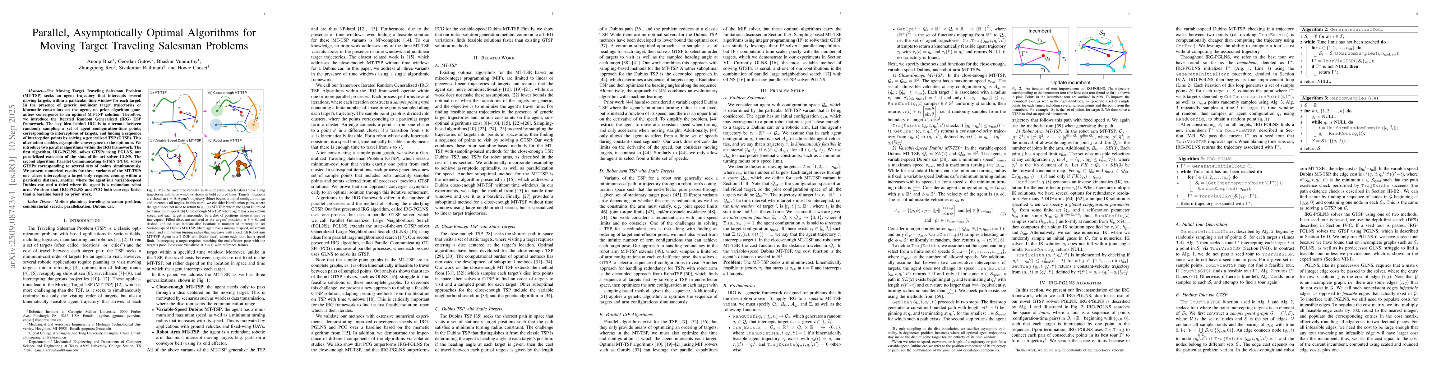 The Moving Target Traveling Salesman Problem (MT-TSP) seeks an agent trajectory that intercepts several moving targets, within a particular time window for each target. In the presence of generic nonlinear target trajectories or kinematic constraints on the agent, no prior algorithm guarantees convergence to an optimal MT-TSP solution. Therefore, we introduce the Iterated Random Generalized (IRG) TSP framework. The key idea behind IRG is to alternate between randomly sampling a set of agent configuration-time points, corresponding to interceptions of targets, and finding a sequence of interception points by solving a generalized TSP (GTSP). This alternation enables asymptotic convergence to the optimum. We introduce two parallel algorithms within the IRG framework. The first algorithm, IRG-PGLNS, solves GTSPs using PGLNS, our parallelized extension of the state-of-the-art solver GLNS. The second algorithm, Parallel Communicating GTSPs (PCG), solves GTSPs corresponding to several sets of points simultaneously. We present numerical results for three variants of the MT-TSP: one where intercepting a target only requires coming within a particular distance, another where the agent is a variable-speed Dubins car, and a third where the agent is a redundant robot arm. We show that IRG-PGLNS and PCG both converge faster than a baseline based on prior work.