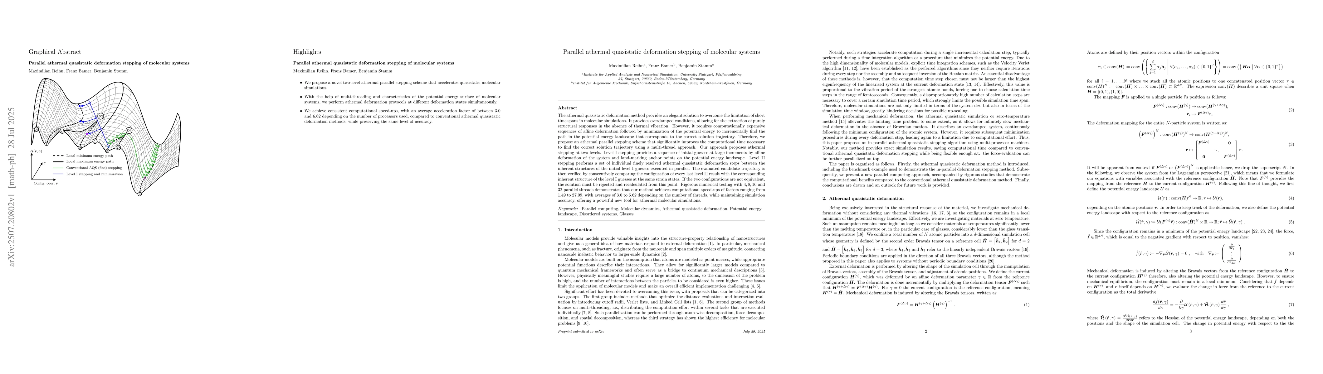 The athermal quasistatic deformation method provides an elegant solution to overcome the limitation of short time spans in molecular simulations. It provides overdamped conditions, allowing for the extraction of purely structural responses in the absence of thermal vibration. However, it requires computationally expensive sequences of affine deformation followed by minimization of the potential energy to incrementally find the path in the potential energy landscape that corresponds to the correct solution trajectory. Therefore, we propose an athermal parallel stepping scheme that significantly improves the computational time necessary to find the correct solution trajectory using a multi-thread approach. Our approach proposes athermal stepping at two levels. Level I stepping provides a sequence of initial guesses at large increments by affine deformation of the system and land-marking anchor points on the potential energy landscape. Level II stepping performs a set of individual finely resolved athermal quasistatic deformation steps between the inherent structures of the initial level I guesses executed in parallel. The evaluated candidate trajectory is then verified by consecutively comparing the configuration of every last level II result with the corresponding inherent structure of the level I guesses at the same strain states. If the two configurations are not equivalent, the solution must be rejected and recalculated from this point. Rigorous numerical testing with $4,8,16$ and $32$ parallel threads demonstrates that our method achieves computational speed-ups of factors ranging from $1.49$ to $27.09$, with averages of $3.0$ to $6.62$ depending on the number of threads, while maintaining simulation accuracy, offering a powerful new tool for athermal molecular simulations.
